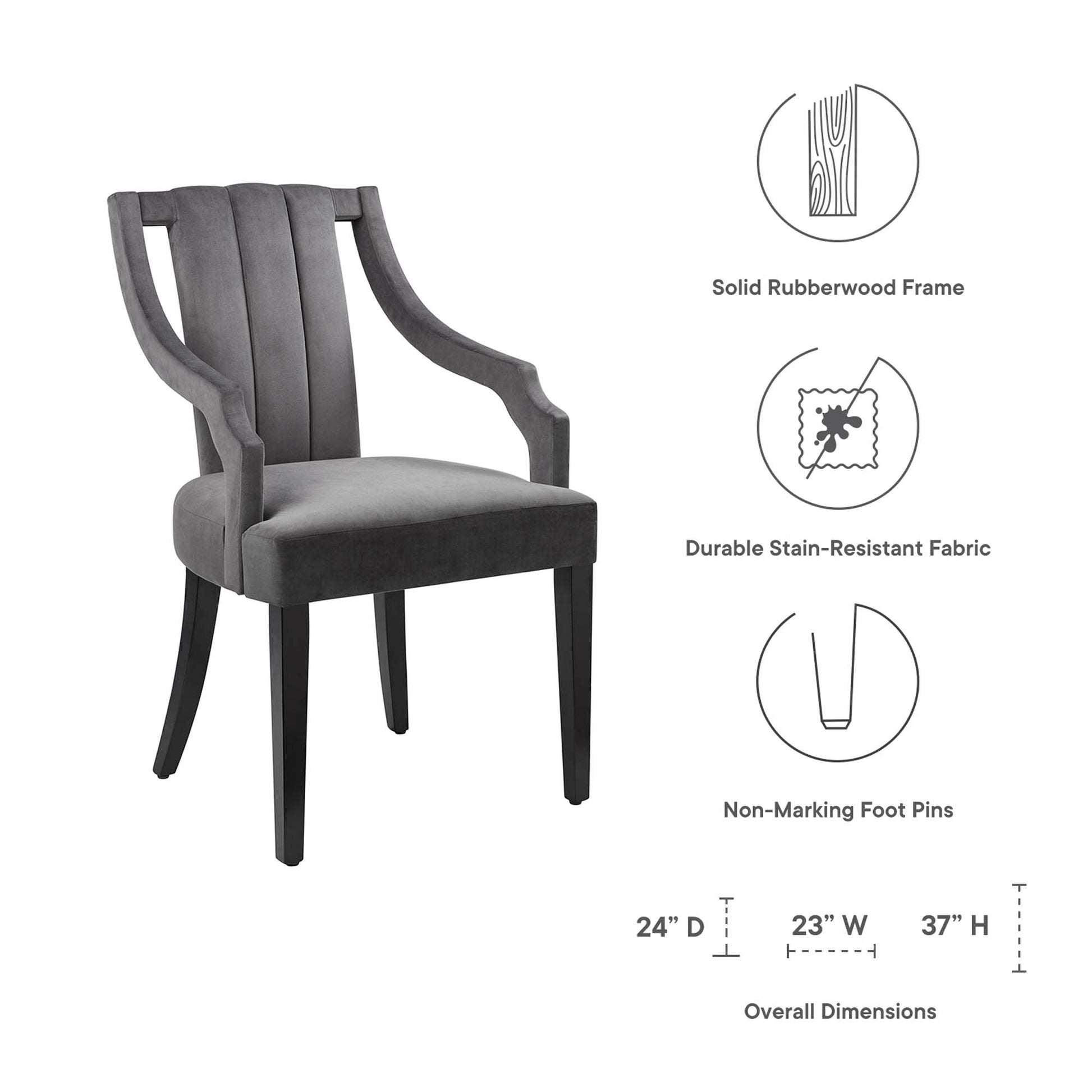 Use:The luxurious essence of the Virtue Performance Velvet Armchairs deliver a desired wow factor to your dining table. This upholstered armchair set is covered in a rich, stain-resistant performance velvet and is defined by its unstoppable charisma. Offering unwavering support and comfort, the seat cushions are padded with dense foam. Precise channel tufting on the backrest adds essential detail and interest while the curved armrests flow gracefully from the powerful top rail, briefly curving inward, then straightening to snuggle securely into the sides of the plush seat cushion. This velvet chair set is braced by solid rubberwood tapered legs resting on non-marking foot pins and exudes a glam deco vintage appeal. Chair Weight Capacity: 500 lbs.,Glam Deco Dining Chairs - Set of 2