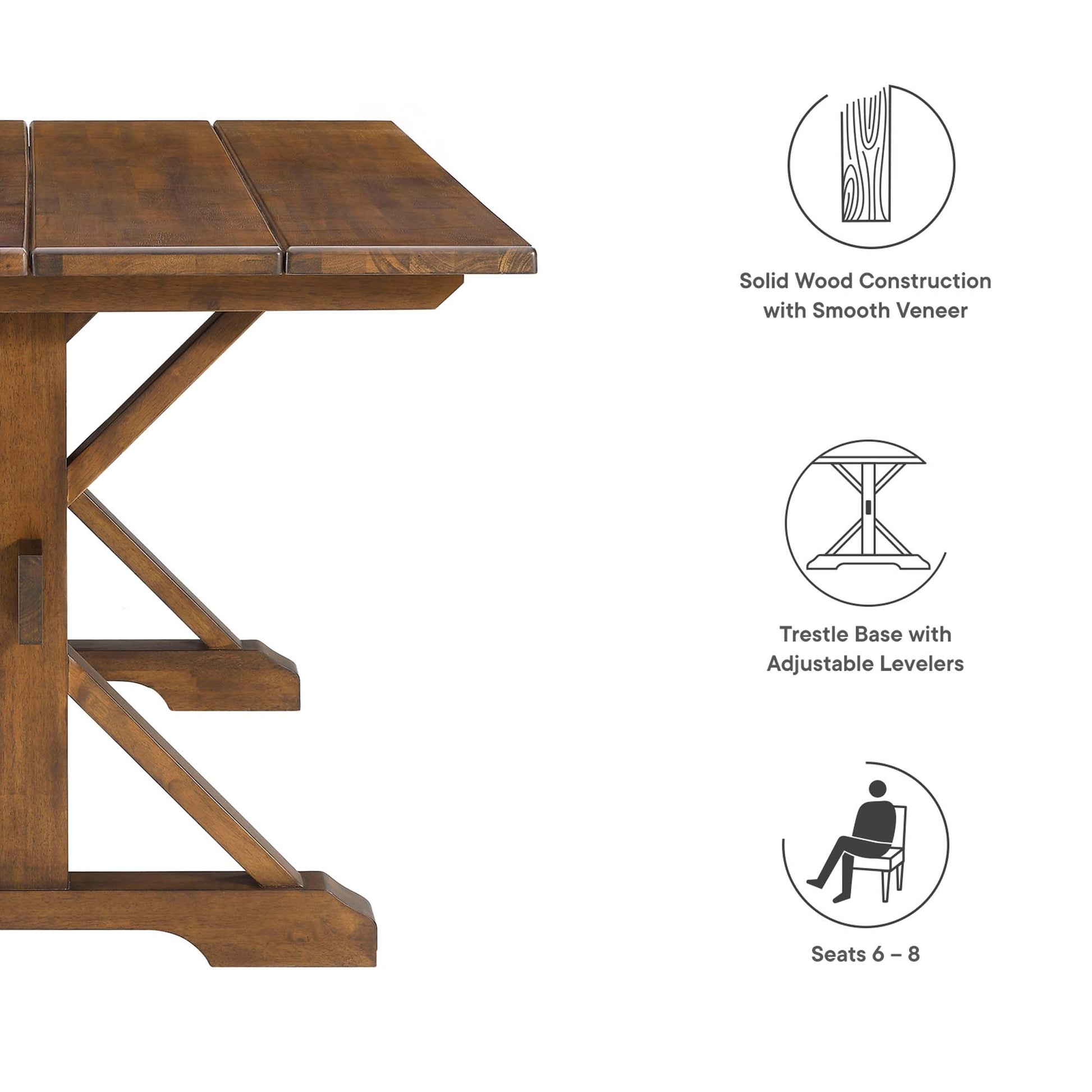 Use:Bring the warmth of the countryside into your dining room with the Windchime 71" Wood Dining Table. Crafted from solid wood and wood veneer, this sturdy trestle table stands 71 inches long, seating 6 to 8 dining chairs comfortably. The natural wood grain elevates the charm, while the trestle base adds a rustic design element. Ideal for both intimate dinners and entertaining family and friends, this wood dining table effortlessly blends farmhouse charm with modern appeal, making it a must-have centerpiece for your home. Simple assembly required. Includes adjustable levelers for added stability and to protect flooring. Weight Capacity: 740 lbs.,Modern Farmhouse Dining Table