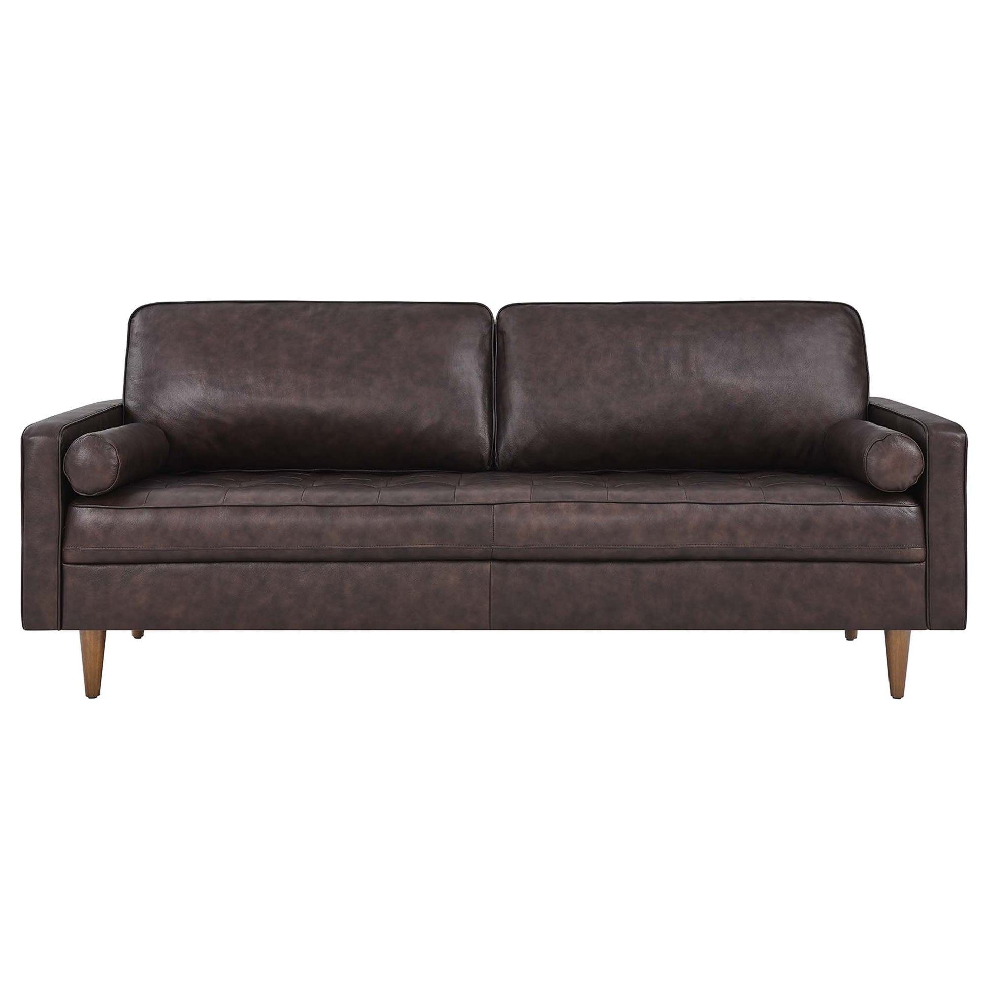 Use:Update your home or apartment with the mid-century style and modern-day convenience of Valour. This comfortable living room sofa features a tailored profile with elegant biscuit tufting and two bolster pillows. Covered in beautiful top grain leather upholstery, Valour has dense foam padding, an innerspring pocket structure, and sinuous spring support for a comprehensive seating experience. This luxe modern sofa comes with walnut-stained wood legs with non-marking foot caps and supports up to 900 lbs. Say goodbye to the days of hauling heavy furniture. This tufted sofa ships in a portable box for easy maneuvering.,Mid-Century Modern Sofa