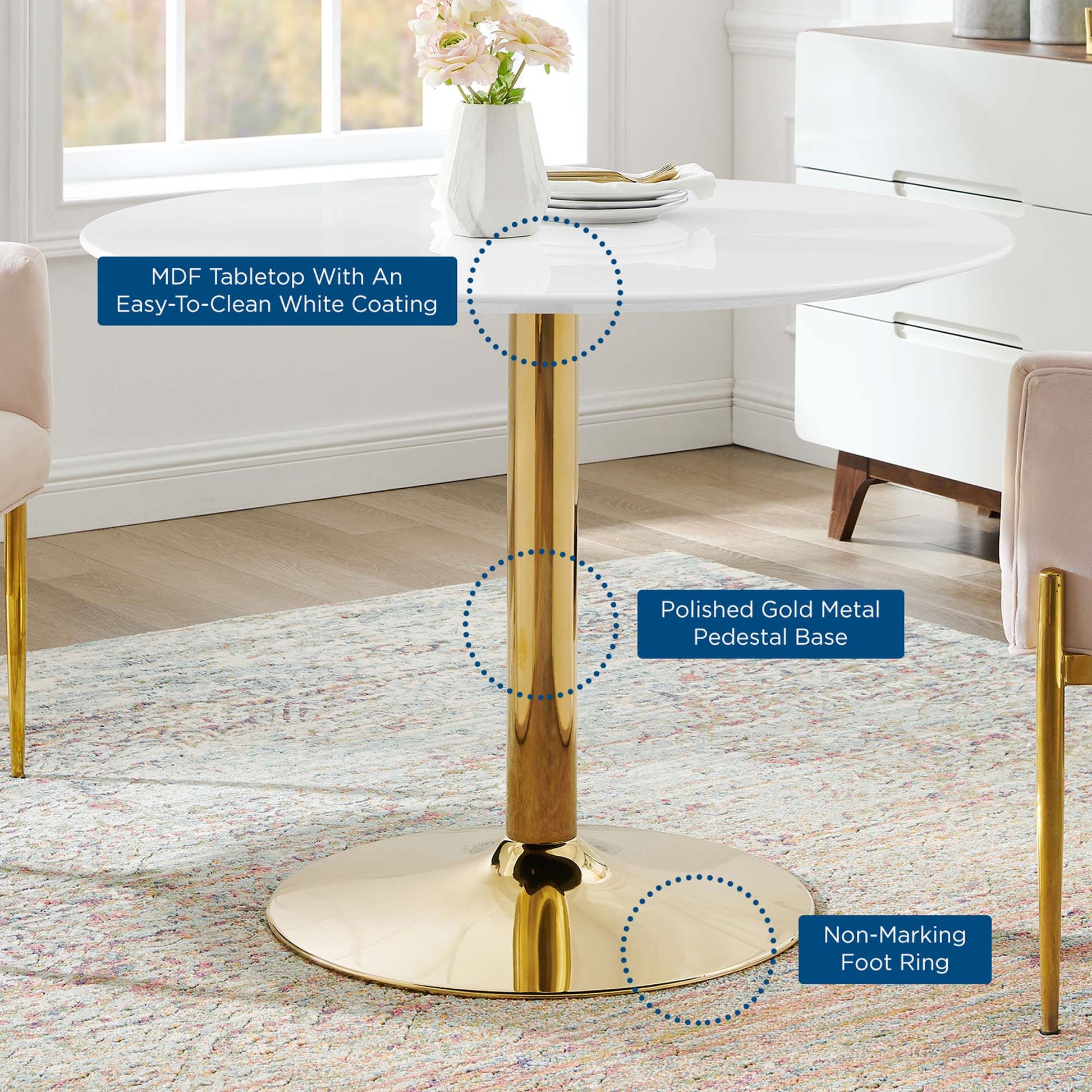 Use:Gather family and friends for good food and conversation around the Verne Dining Table. Bringing modern influence and mid-century inspiration to your dining space, this pedestal table reflects an organic shape. Perfect for entertaining or everyday dining, this dining table rests on a polished gold metal pedestal base and features a 40" tabletop crafted with MDF and an easy-to-clean white coating. Non-marking foot ring to protect flooring. Assembly required.
