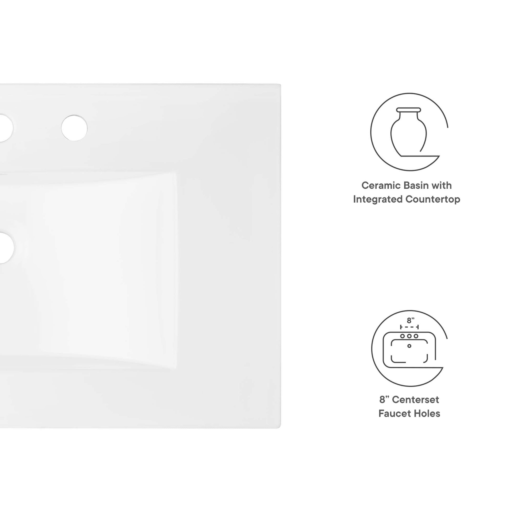 Use:Wash, rinse, and brush in modern style with the Cayman 30" Sink. This ceramic sink boasts 8-inch centerset faucet holes, an integrated countertop, and a rectangular basin design, all coming together to create a modern and sophisticated look for your bathroom space. Elevate your daily routine with this contemporary sink that combines functionality and aesthetic appeal flawlessly.