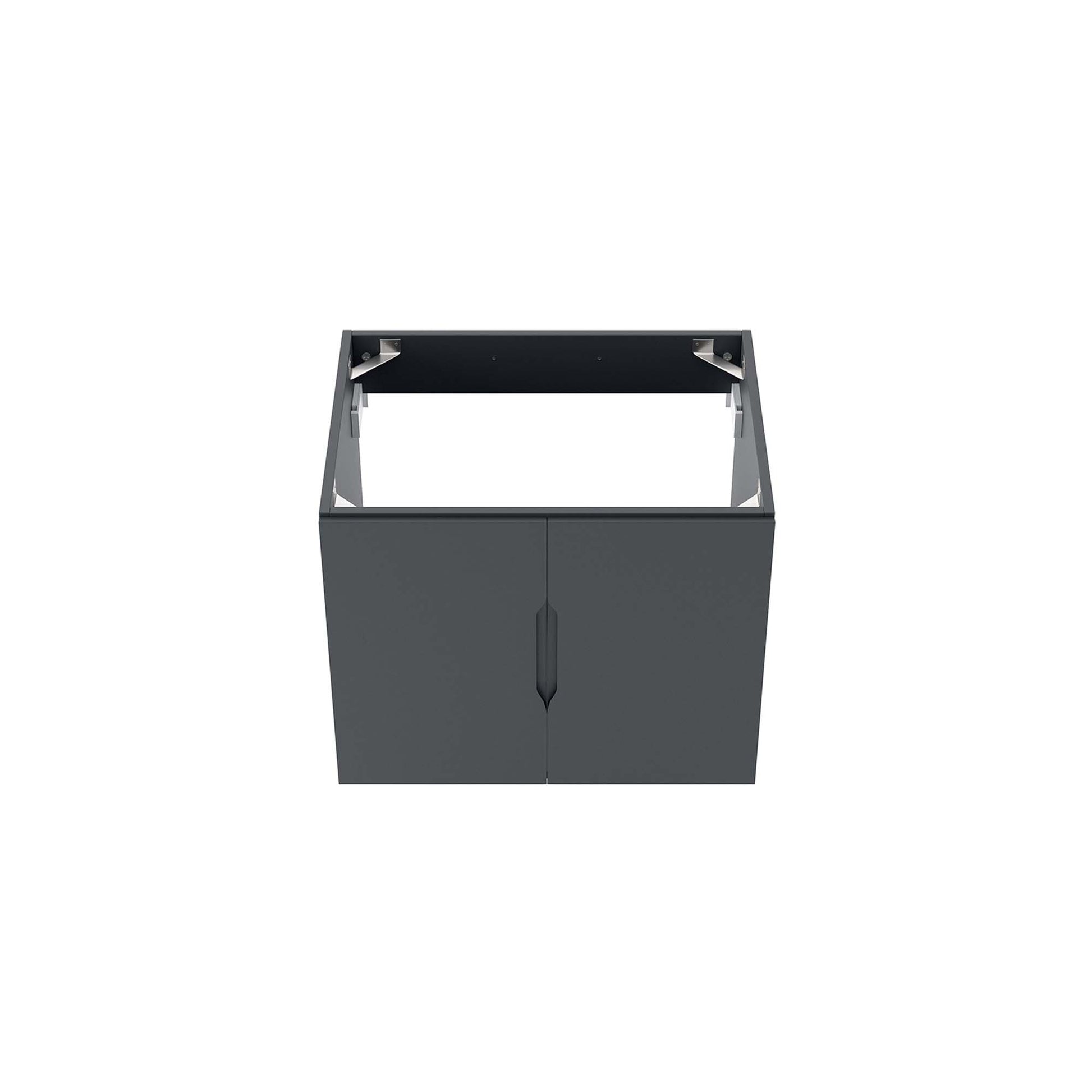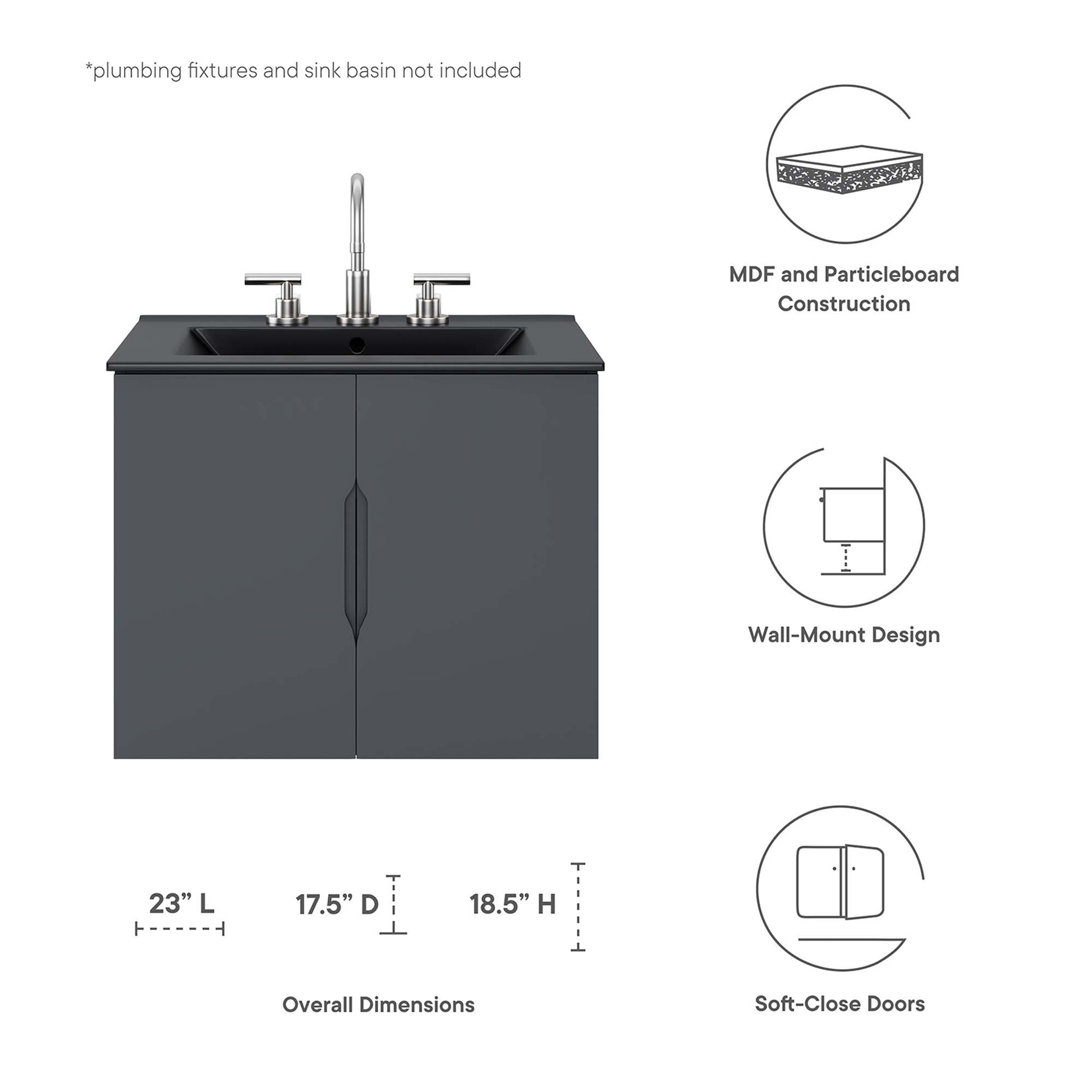 Use:Energize your bathroom space with the modern design of the Vitality 24" Wall-Mount Bathroom Vanity. Boasting a sleek, clean-lined silhouette, this vanity is durably crafted with particleboard and MDF with a melamine finish. This vanity features a wall-mount design and is complete with ample storage space for all your bathroom essentials behind two soft-close doors. This vanity boasts an open back design to accommodate plumbing. Sink basin and fixtures not included. Assembly required.,Modern Bathroom Vanity