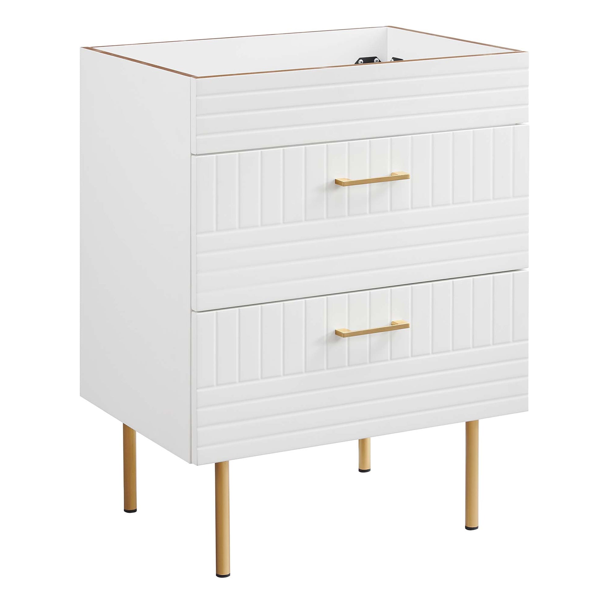 Use:Refresh your bathroom space with the contemporary style of the Daybreak 24" Bathroom Vanity. Featuring a modern silhouette, sophisticated matte finish, and brushed gold metal hardware, this vanity is durably crafted with a blend of rubberwood, MDF, and particleboard to create a lasting vanity for your bathroom. Raised off the ground by gold metal legs, this bathroom vanity is complete with ample storage in its drawers to accommodate bathroom essentials and a cut-out design in the top drawer for plumbing. Includes non-marking foot caps. Assembly required. Sink basin and fixtures not included.,Modern Bathroom Vanity