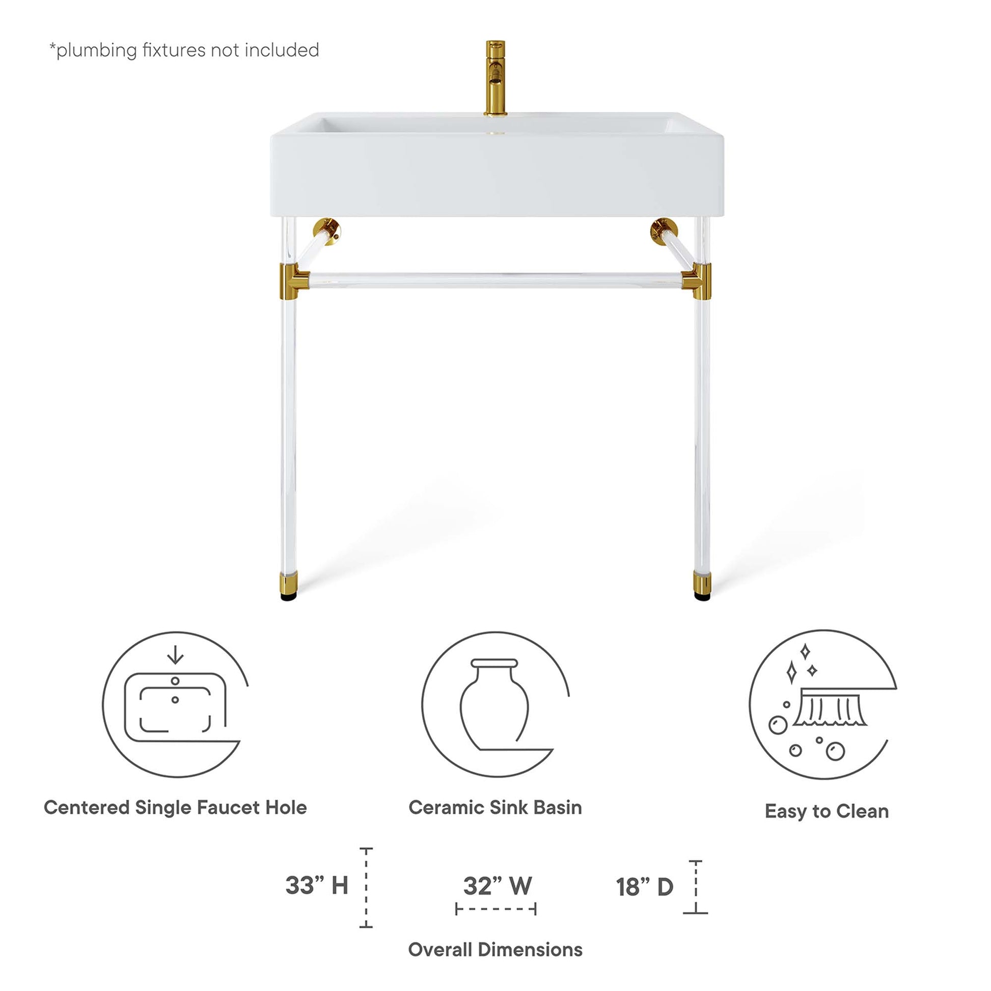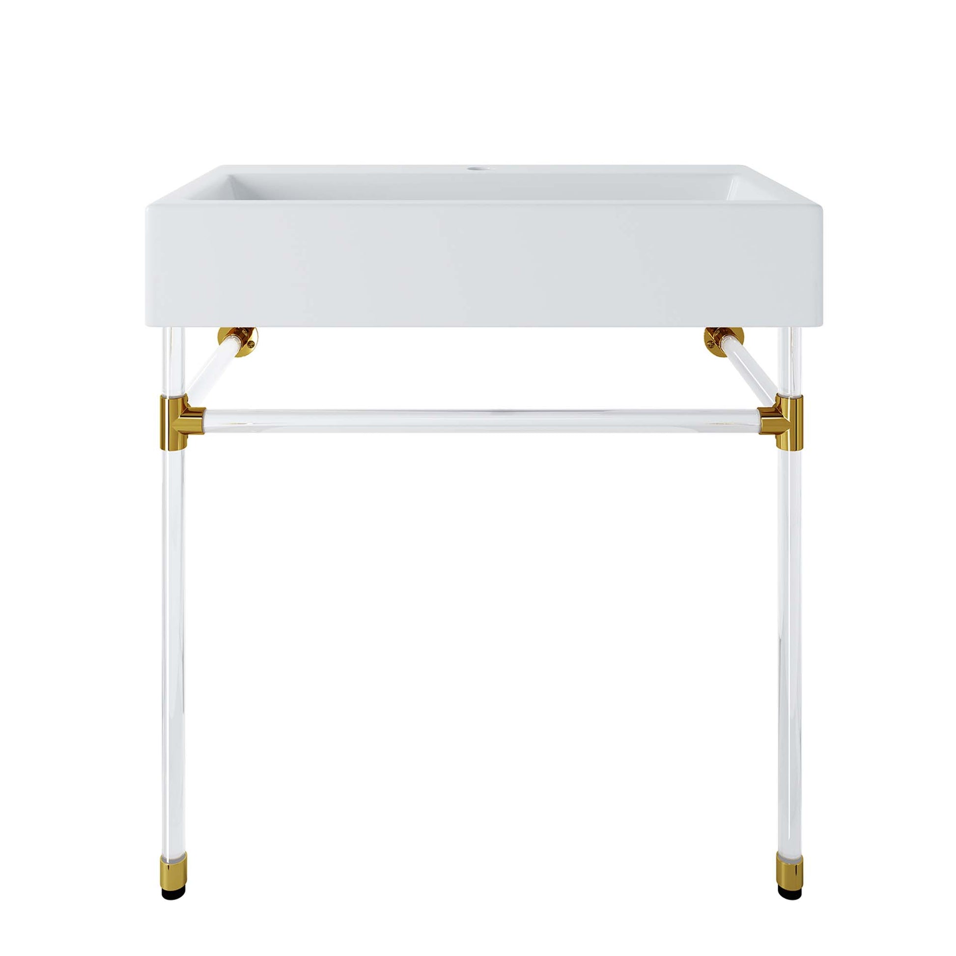 Use:Create a bathroom oasis with the minimalist style and efficiency of the Redeem Wall-Mount Acrylic Bathroom Vanity. The glossy white ceramic basin and streamlined acrylic frame affix directly and securely to the bathroom or powder room wall. Redeem dispenses gentility in spaces large and small, resting confidently on a sturdy acrylic frame with gold joints for added stability. This bathroom vanity has a single faucet hole and is outfitted with non-marking foot caps to protect your bathroom floor. Assembly required and fixtures not included.,Contemporary Bathroom Vanity
