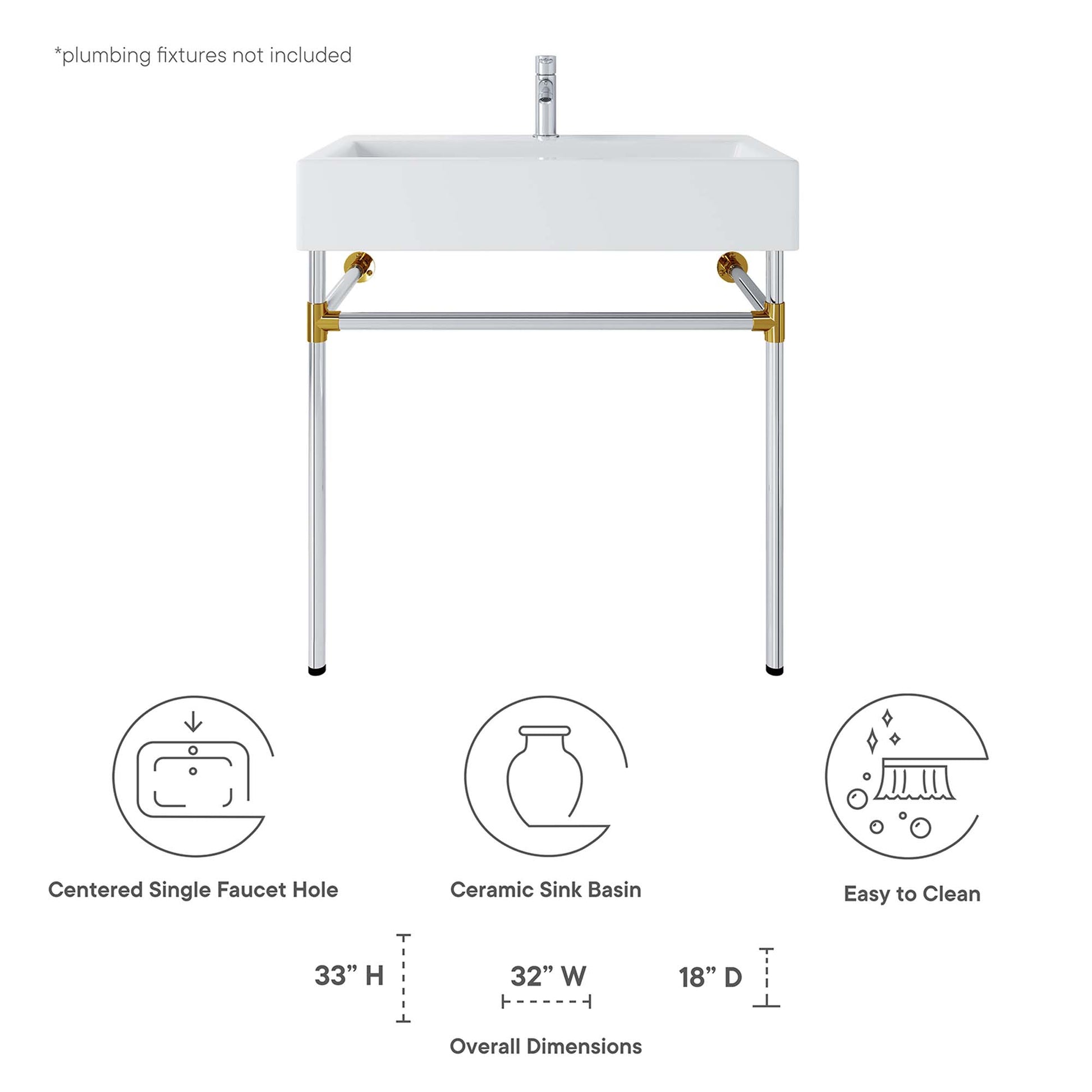 Use:Create a bathroom oasis with the minimalist style and efficiency of the Redeem Wall-Mount Silver Stainless Steel Bathroom Vanity. The glossy white ceramic basin and robust stainless steel frame affix directly and securely to the bathroom or powder room wall. Redeem dispenses gentility in the modern bathroom, resting confidently on a silver stainless steal frame with gold joints for added stability. This elegant bathroom vanity has a single faucet hole and is outfitted with non-marking foot caps to protect your bathroom or powder room floor. Assembly required and fixtures are not included.,Contemporary Bathroom Vanity