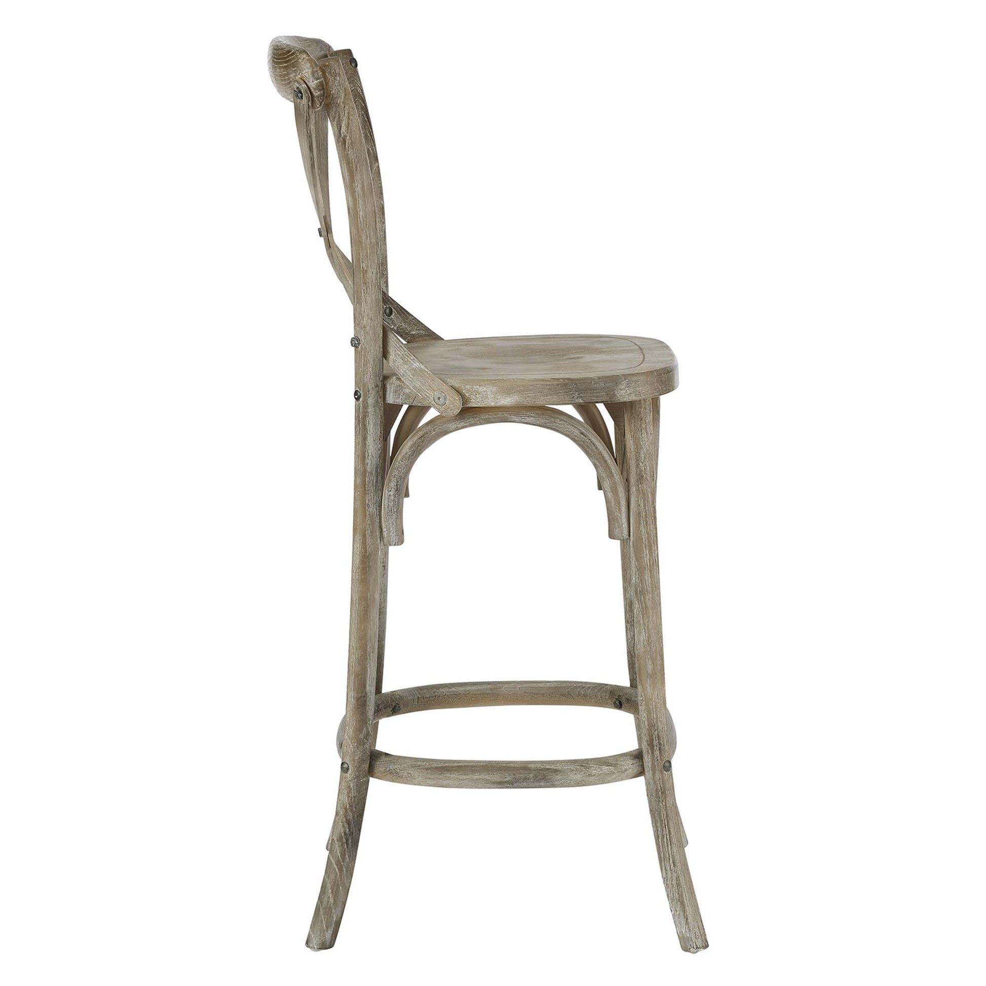 Use:Introduce feelings of nostalgia as you gather around the kitchen counter for a quick breakfast or dinner with friends with the Gear Counter Stool. Blending farmhouse charm with modern style, this counter-height bar stool features an X-brace back and stretchers between splayed legs. With non-marking foot caps to protect flooring, this counter stool is durably crafted with durable elm wood for a sturdy construction built to last. Make a statement in your dining space or kitchen area with this versatile wood counter stool. Weight Capacity: 330 lbs.