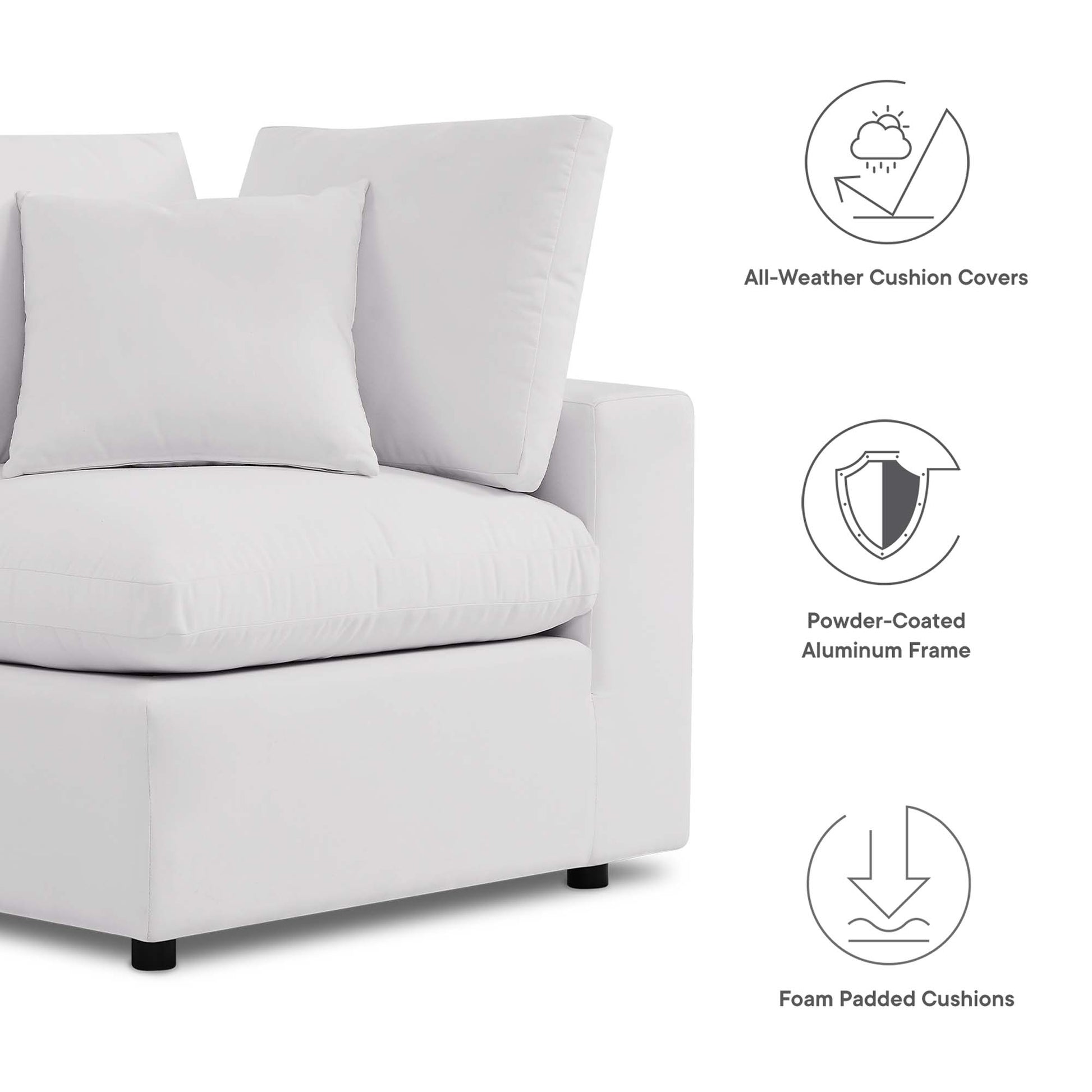 Use:A haven for cozy relaxation right in your own backyard, Commix features plush comfort, a clean-lined design, and a spacious profile that makes an attractive statement on the porch, patio, or by the poolside. Made for sprawling out in the sun or curling up with a good book, this patio sofa features generously padded cushions covered in water-resistant and UV-resistant covers making them ideal for your outdoor space. This outdoor three-seater sofa features an all-weather construction with a powder-coated aluminum frame and non-marking foot caps to protect flooring surfaces. Beckoning guests to sit and stay a while, the Commix Outdoor Patio Collection is perfect for al fresco entertaining or lounging amidst warm weather. Each Seat Weight Capacity: 300 lbs.