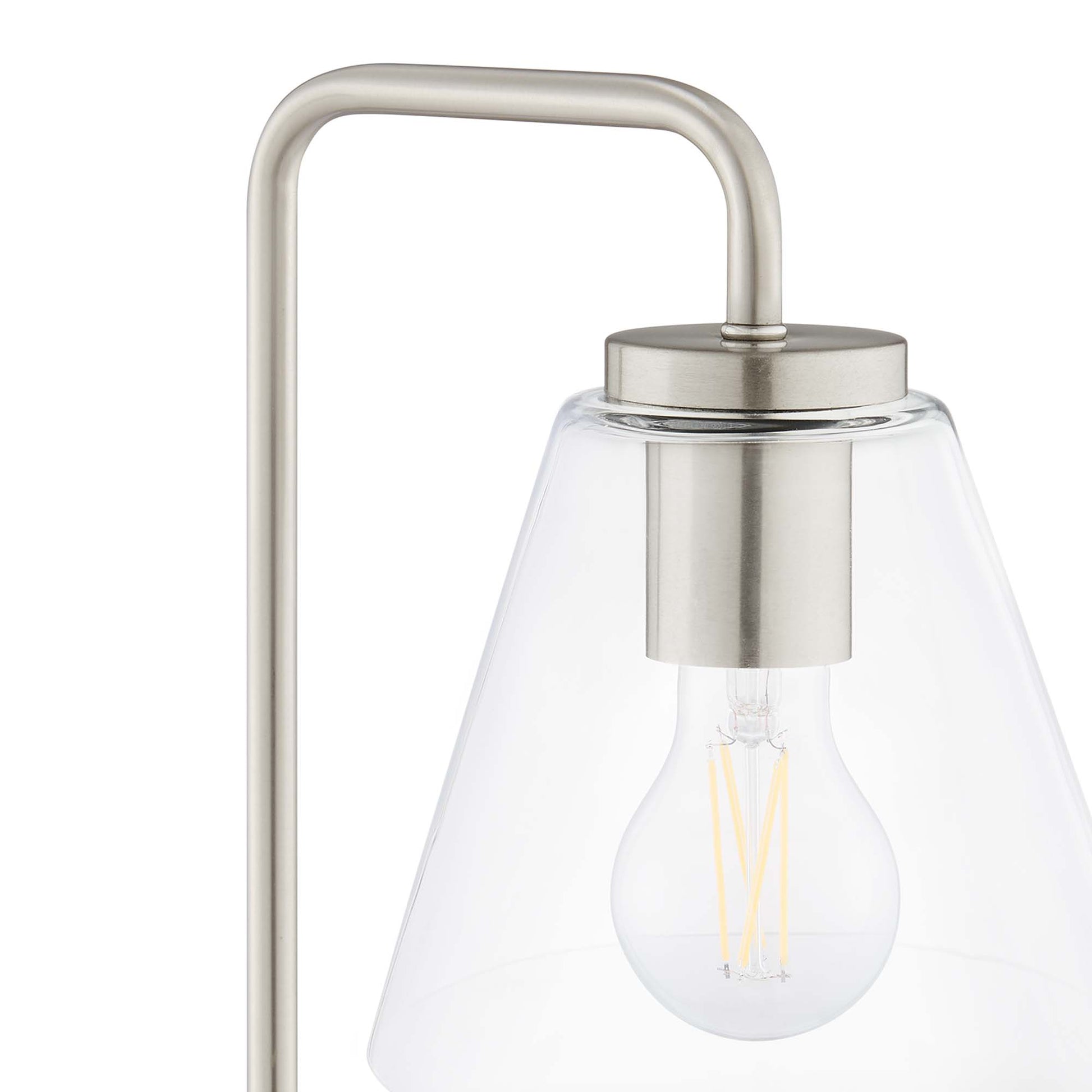 Use:The Element Glass Table Lamp accentuates your home d??cor in the living room, bedroom, office, or study room with its distinctive mid-century modern aesthetic. This side table lamp brings farmhouse appeal to mid-century modern, contemporary, rustic, or eclectic decors, boasting a classic transparent glass cone shade. An ideal desk lamp for the home office, Element is solidly constructed with a bent-pipe arm and a round iron base. This dimmable coffee table lamp is equipped with a black power cord and a convenient on/off switch. Requires 1 E26 60W max bulb or LED equivalent (not included). Compatible with dimmer switches (not included). Assembly required. Clean with a soft, damp cloth.,Transparent Glass