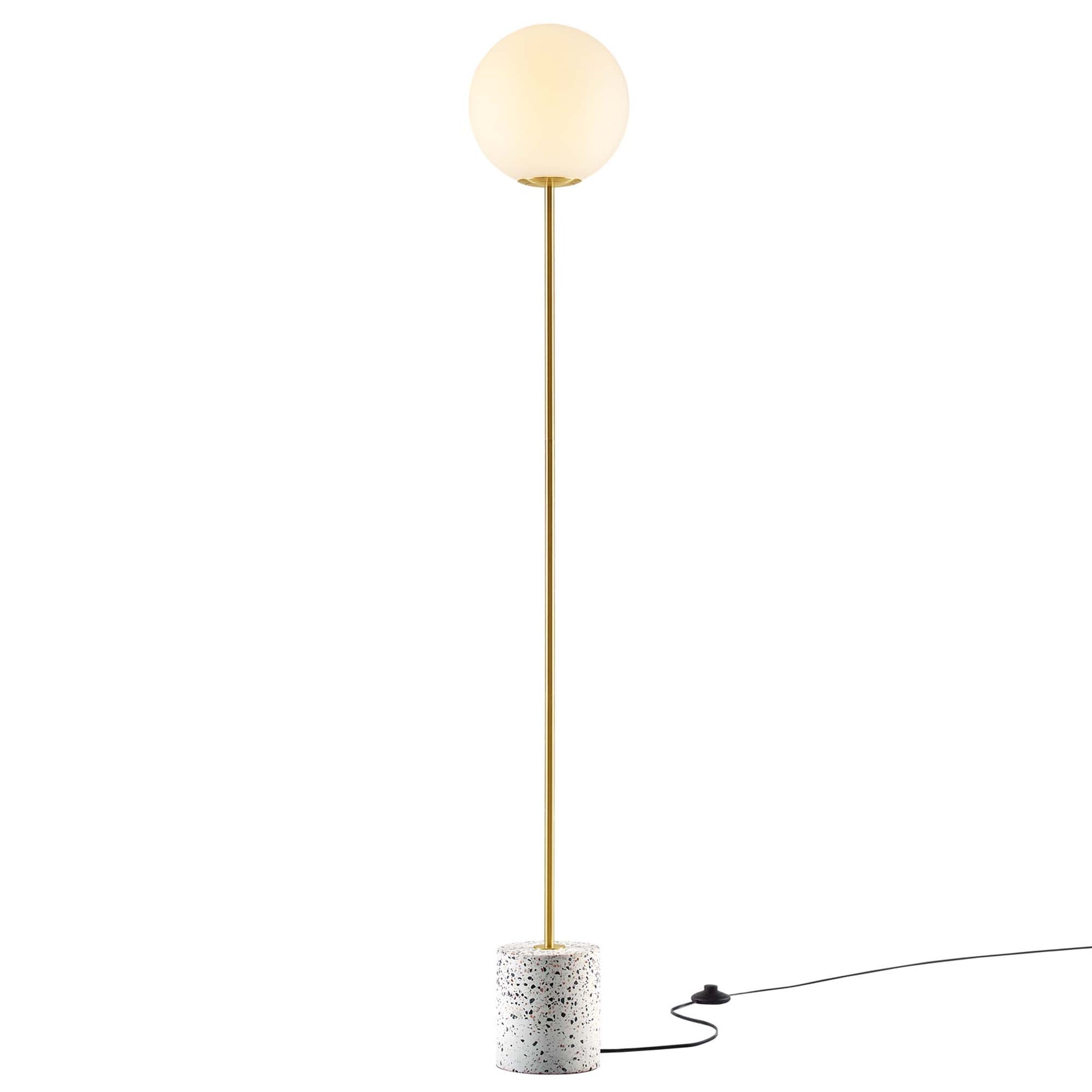 Use:Bring intrigue into your home ambient lighting with the Logic Terrazzo Floor Lamp in your bedroom, living room, office, or study. This tall standing lamp dispenses a tranquil aura complementing mid-century modern, contemporary, or eclectic decors. A captivating floor lamp for the living room, Logic illuminates with an opaque glass globe shade resting on a satin brass rod rising from a smooth terrazzo column base. This sculpted reading floor lamp has a black power cord with a convenient on/off switch. A modern floor lamp, Logic takes 1 G45 E12 40W max bulb or LED equivalent (not included). Compatible with dimmer switches (not included). Assembly required. Clean with a soft, damp cloth.,Floor Lamp