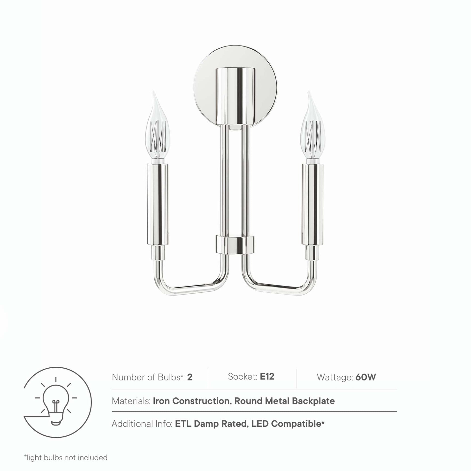 Use:Illuminate your living space with the artful elegance of the Rekindle 2-Light Wall Sconce that complements a variety of decors from mid-century modern to minimalist contemporary. A timeless piece for a living room, dining room, entryway, hallway, home office, or bathroom, this sconce light features two upturned arms extending out from a cylindrical centerpiece and round backplate with ceramic lamp holders to host exposed light bulbs. The Rekindle Light Fixture is damp rated and requires two E12 light bulbs 60W max or LED equivalent (not included). Professional installation required.,2-Light Wall Sconce