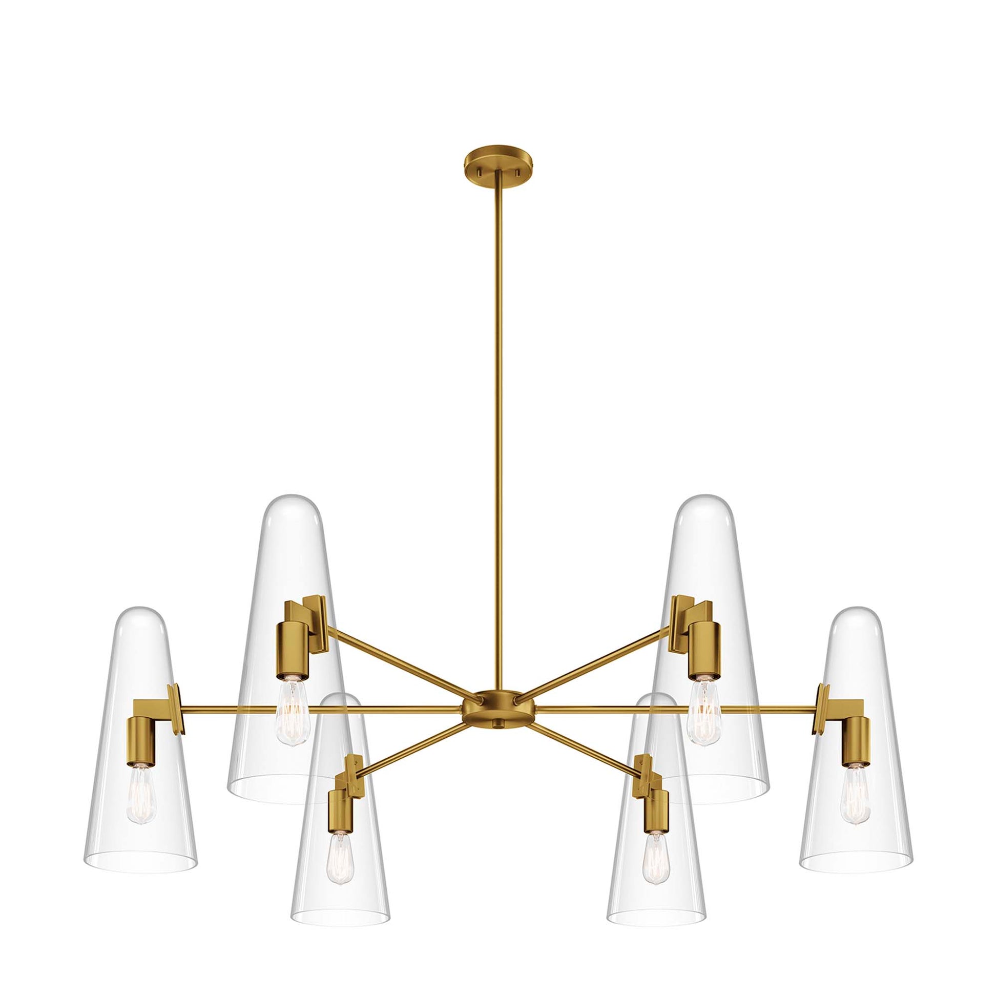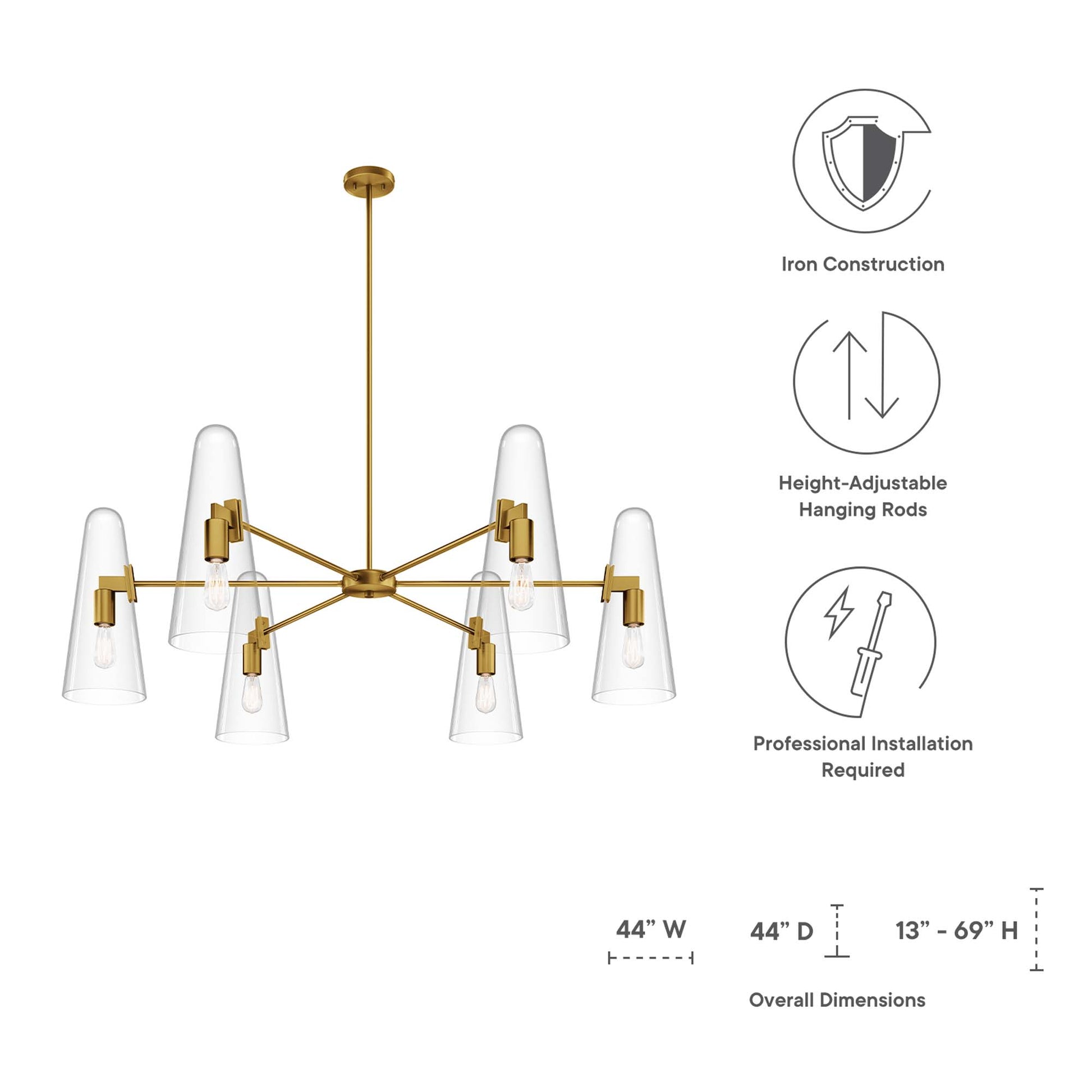 Use:The Beacon 6-Light Chandelier updates a living space, bedroom, kitchen, dining room, bathroom, or office with minimalist sleekness that makes a modern statement. Compatible with sloped ceilings, Beacon has a ceiling canopy with a swivel adaptor and features a five piece, height-adjustable hanging rod to suit a range of ceiling heights. Offering a warm glow through six slim glass cone shades, this light fixture requires six E26 bulbs 60W max or LED equivalent (not included). ETL Listed for Damp Locations. Luminaires that are ?Suitable for Damp Locations? are approved for areas that are regularly exposed to moisture and condensation. Professional installation required.,Modern 6-Light Chandelier
