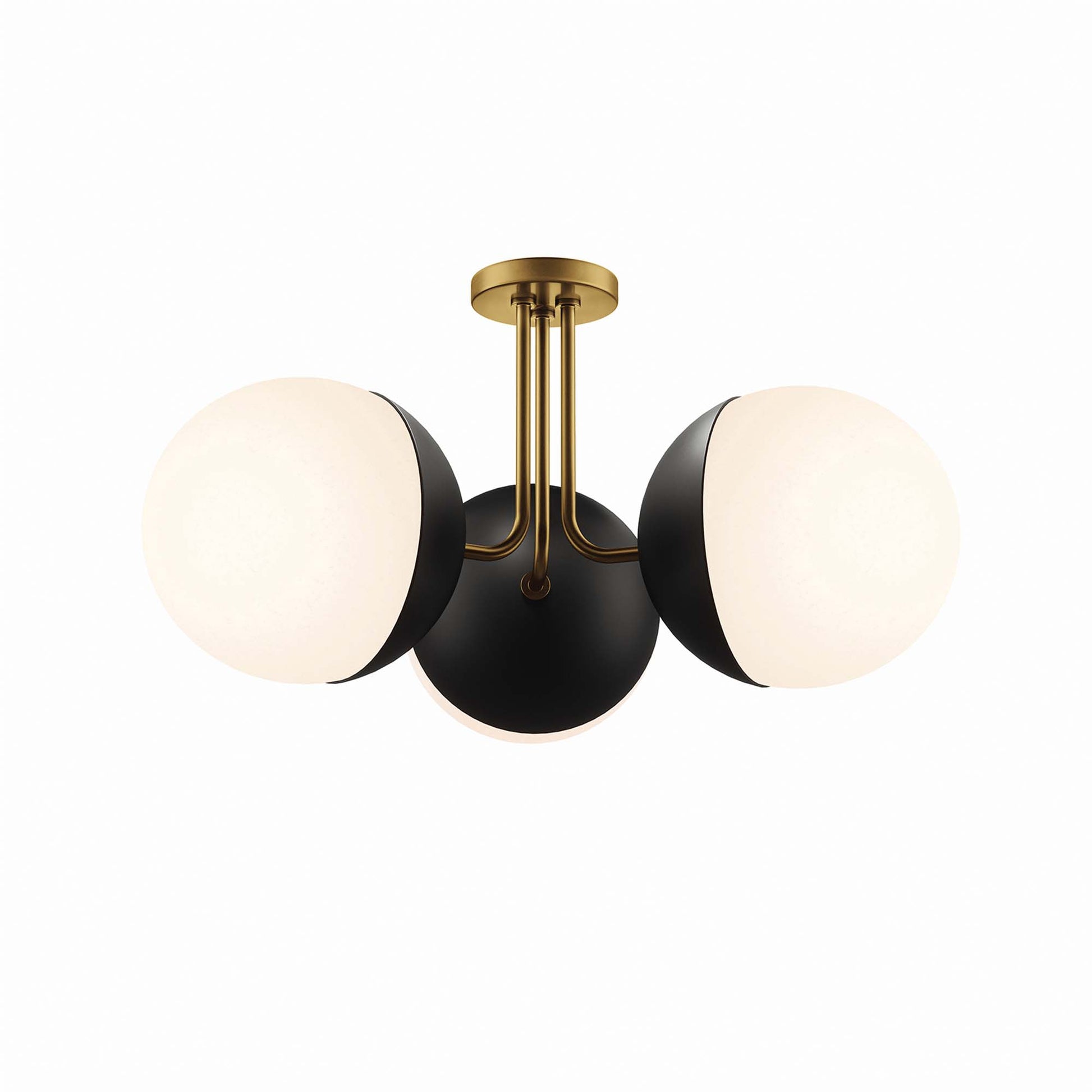 Use:Cast a warm, ambient glow around your home or apartment with the Stellar 3-Light Semi-Flush Ceiling Light. Adding contemporary charm to a kitchen, dining room, bedroom, office, hallway, entryway, or other living space, this spherical light fixture features frosted glass shades that attach to matte black metal bases. Suspended by a semi-flush mount ceiling canopy, the lights on this pendant are affixed with sleek metal arms. This ceiling light requires three E26 bulbs 60W max or LED equivalent (not included). Damp rated for use in the bathroom. Professional installation required.,Modern 3-Light Ceiling Light