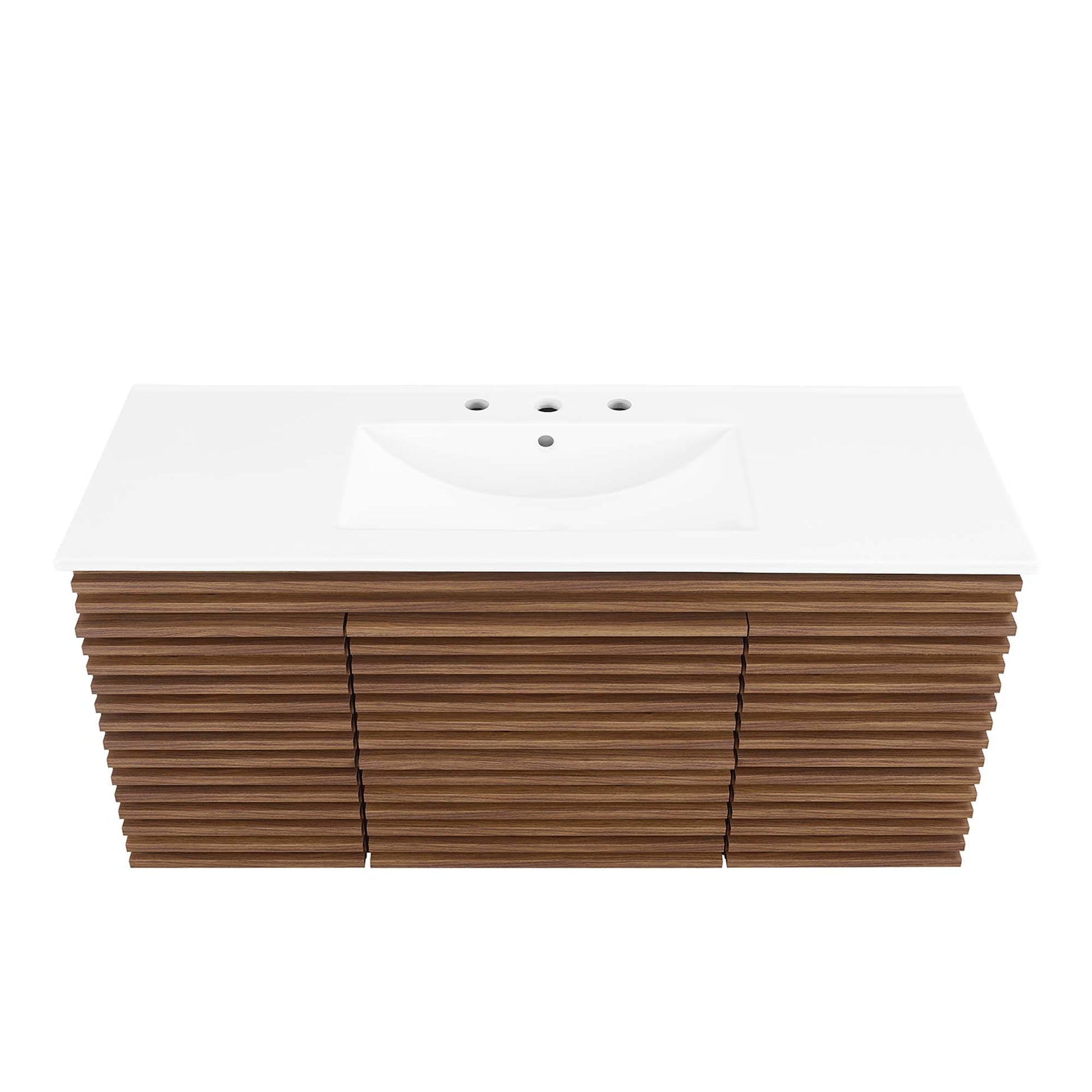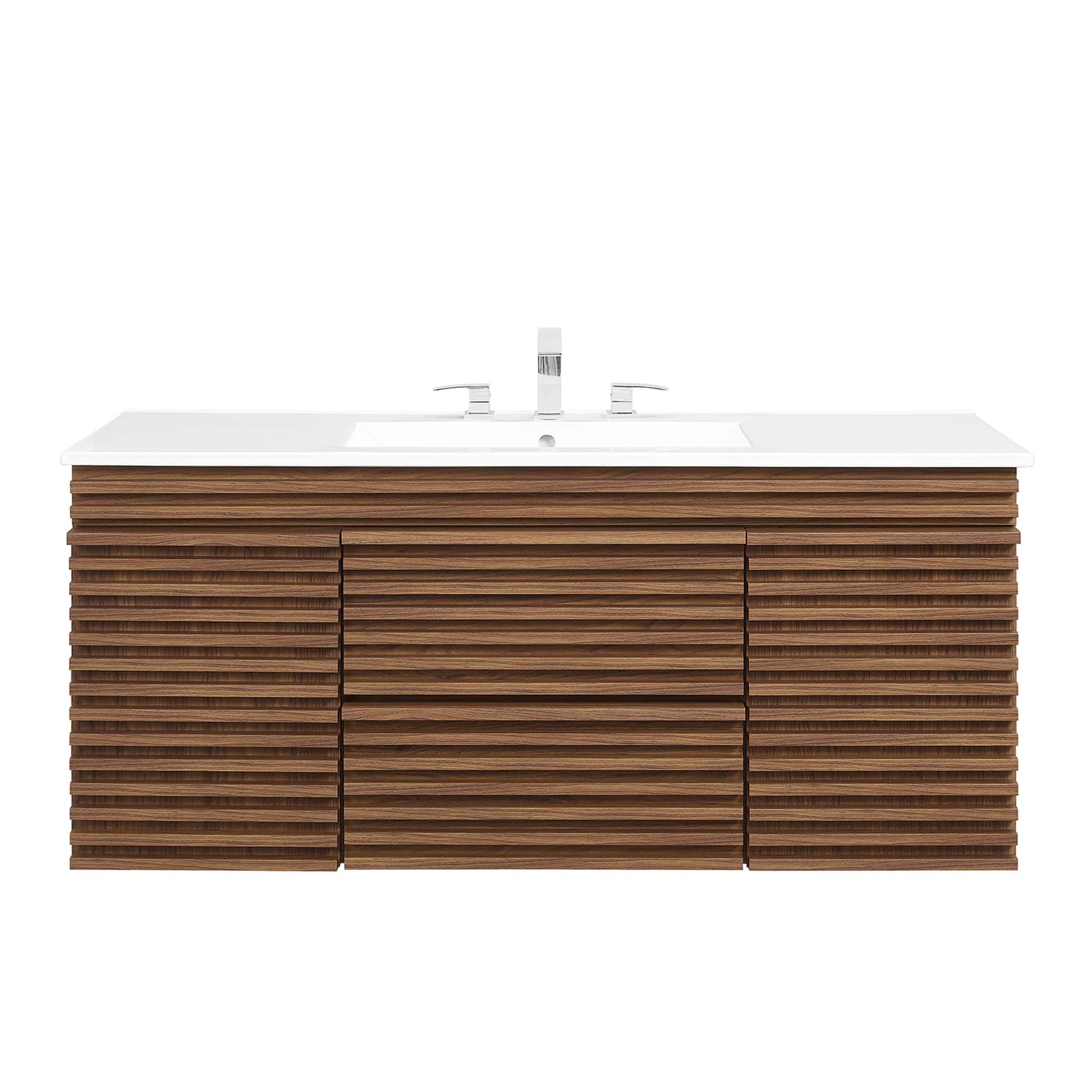 Use:Tap into mid-century aesthetics with the Render Vanity. The Render 48" Single Sink Bathroom Vanity features a durable MDF and particleboard frame with a smooth laminate, ample storage space in two full-extension drawers, adjustable shelves behind soft-close hinged doors, and a space-saving wall-mount design. A curved ceramic basin with an integrated countertop and 8" centerset faucet holes creates sleek lines and a crisp design for an edgy look designed to meet your needs. Boasting a mid-century modern style this vanity features a solid construction with a pleasing look and practical functionality. Assembly required. Fixtures not included.
