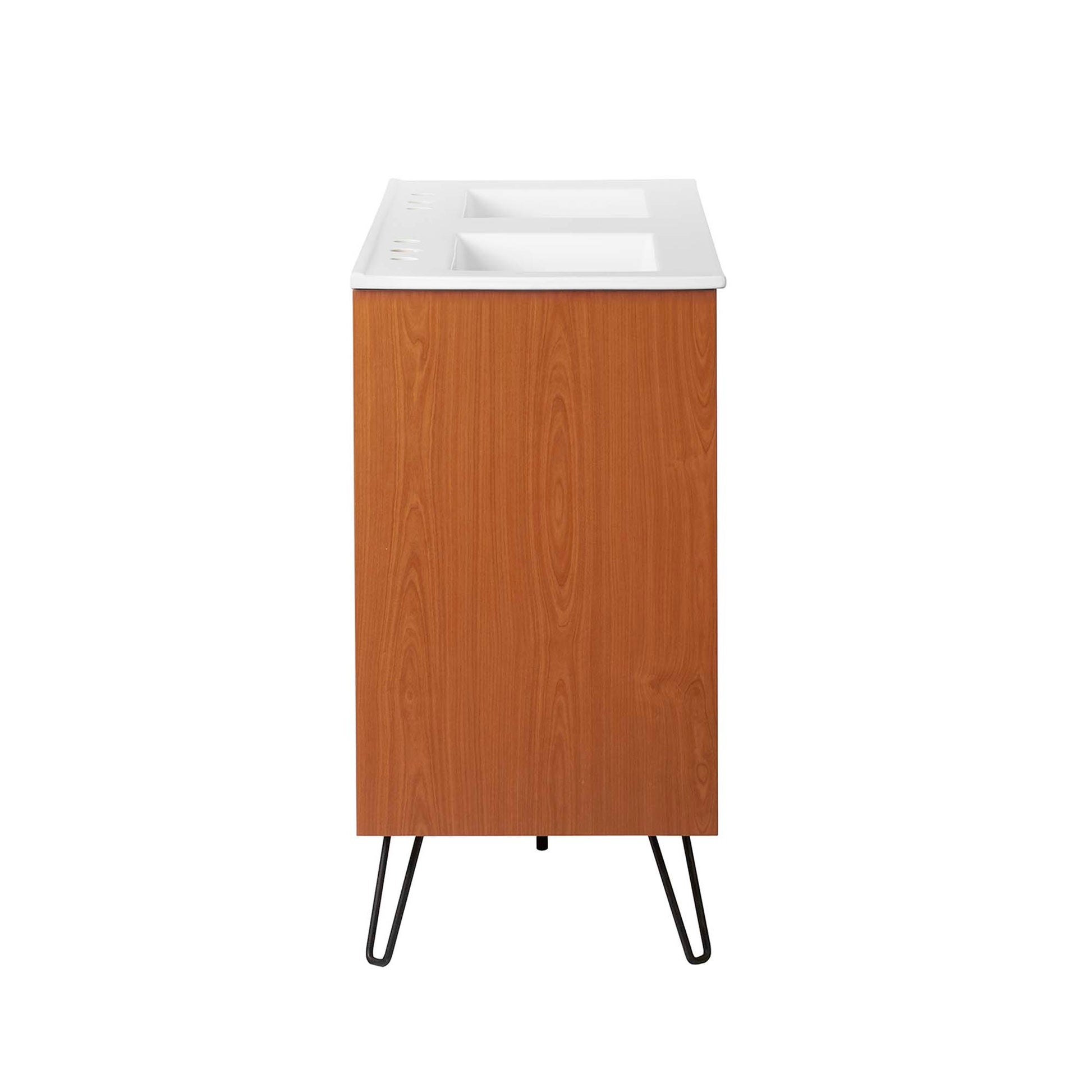 Use:Instill mid-century modern energy in your bathroom decor with the Energize 48" Bathroom Vanity. Resting on four metal hairpin legs, this bathroom vanity cabinet features a durable particleboard and MDF construction and a ceramic double sink basin with 8-inch centerset holes and an integrated countertop. Behind soft-close doors with cutaway designs for easy open and close functionality is a spacious shelved storage area to keep all your bathroom essentials organized and concealed. The sleek look aligns with Scandinavian modern style for a dynamic vanity designed for a multitude of decor styles from modern to contemporary. This double sink has 8" between basins and 24" between basin sink holes. Fixtures not included. Assembly required.,Mid-Century Modern Bathroom Vanity