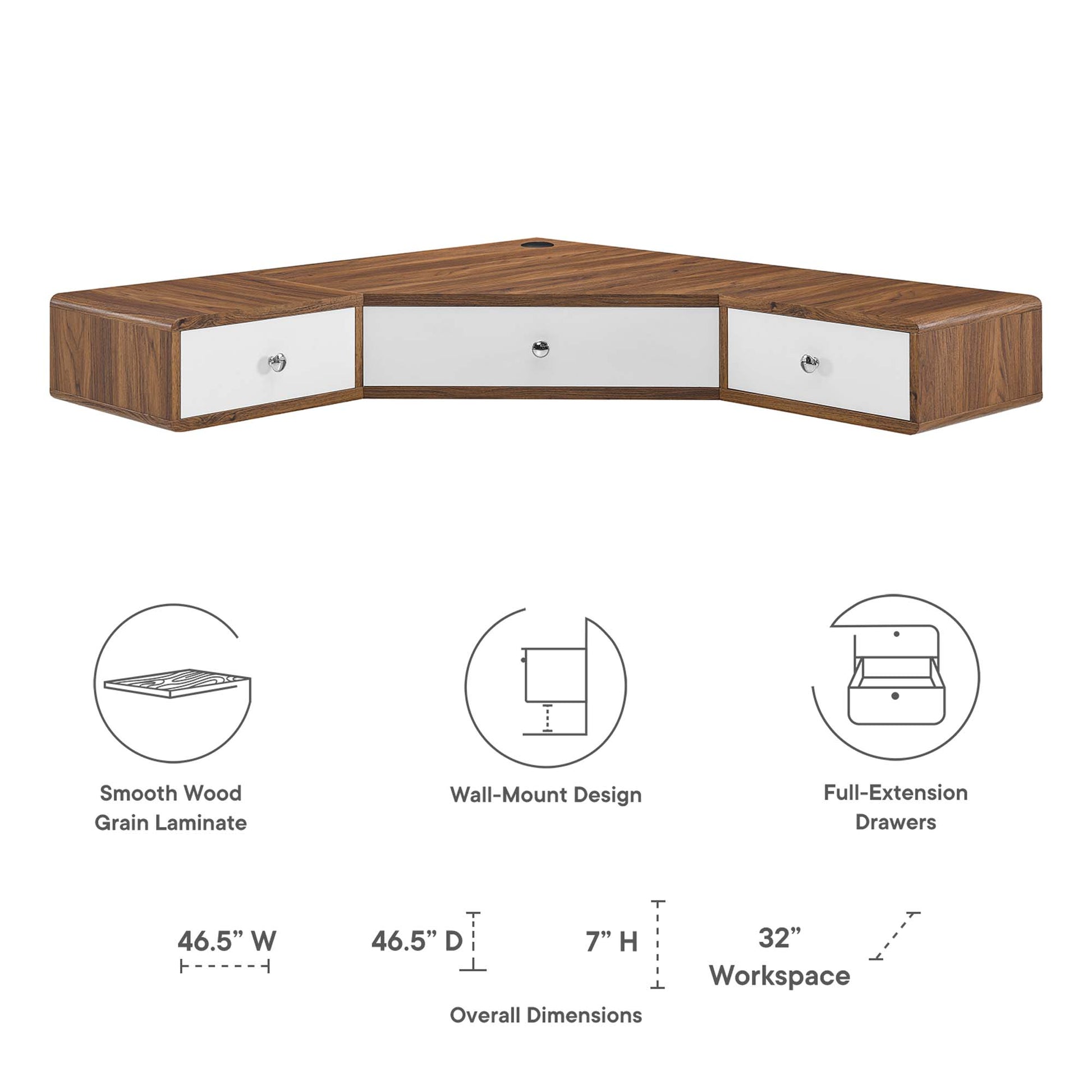 Use:Harness the iconic energy of mid-century style in your home office with the Transmit Wall-Mount Corner Office Desk. Abounding in retro modern design, this computer desk is complete with three full-extension drawers for ample storage space of all your office essentials and a cable management hole to keep your workspace neat and organized. This durable office desk is built with a sturdy particleboard frame with a smooth walnut wood grain laminate and white lacquer drawer fronts with chrome metal hardware. Mounting directly to the wall, this corner office desk is an instant update to your workspace. Assembly required. Weight limit: 331 lbs.,Corner Office Desk