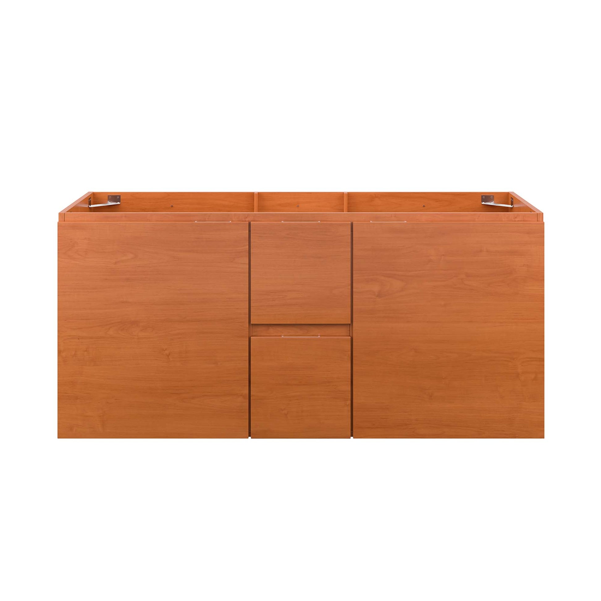 Use:Streamlined design takes center stage in your bathroom with the Scenic 48" Wall-Mount Bathroom Vanity Cabinet. Boasting clean lines and modern style, this bathroom vanity is crafted with melamine and features a beautiful wood grain finish that incorporates natural aesthetics. Mounting directly to the wall with a drywall-friendly metal cleat, this vanity cabinet offers ample storage space for bathroom essentials in two full-extension center drawers and on height adjustable shelves behind soft-close doors. Sink basin and fixtures not included. Assembly required.,Wall-Mount Bathroom Vanity Cabinet