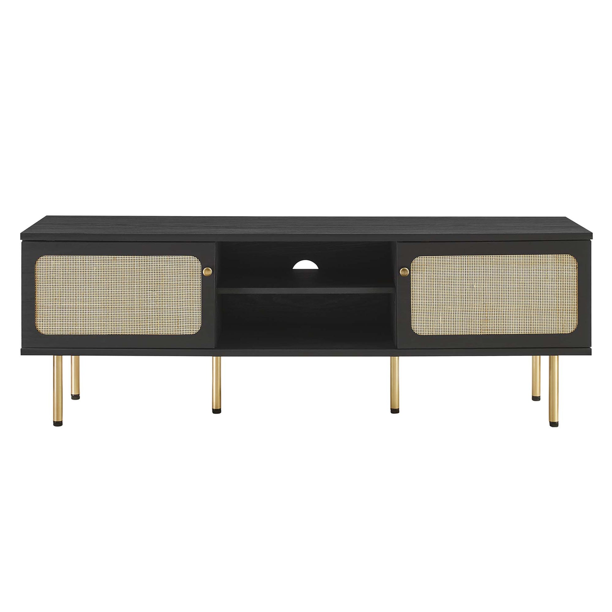 Use:Bring trending organic aesthetics to your living space with the Cambria TV Stand. This entertainment center rests on cylindrical metal legs with non-marking foot caps and features a natural rattan weave along the front of two sliding doors that partially conceal the shelving area. A versatile addition to a living room, bedroom, home office, or lounge area, this media console is crafted with durable particleboard and features three cable management holes that also allow for flow-through ventilation. Keep visual space clean with the ample storage space for media essentials. This entertainment stand accommodates flat screen TVs up to 66". Assembly required. Weight Limit: 189 lbs.,Modern TV Stand