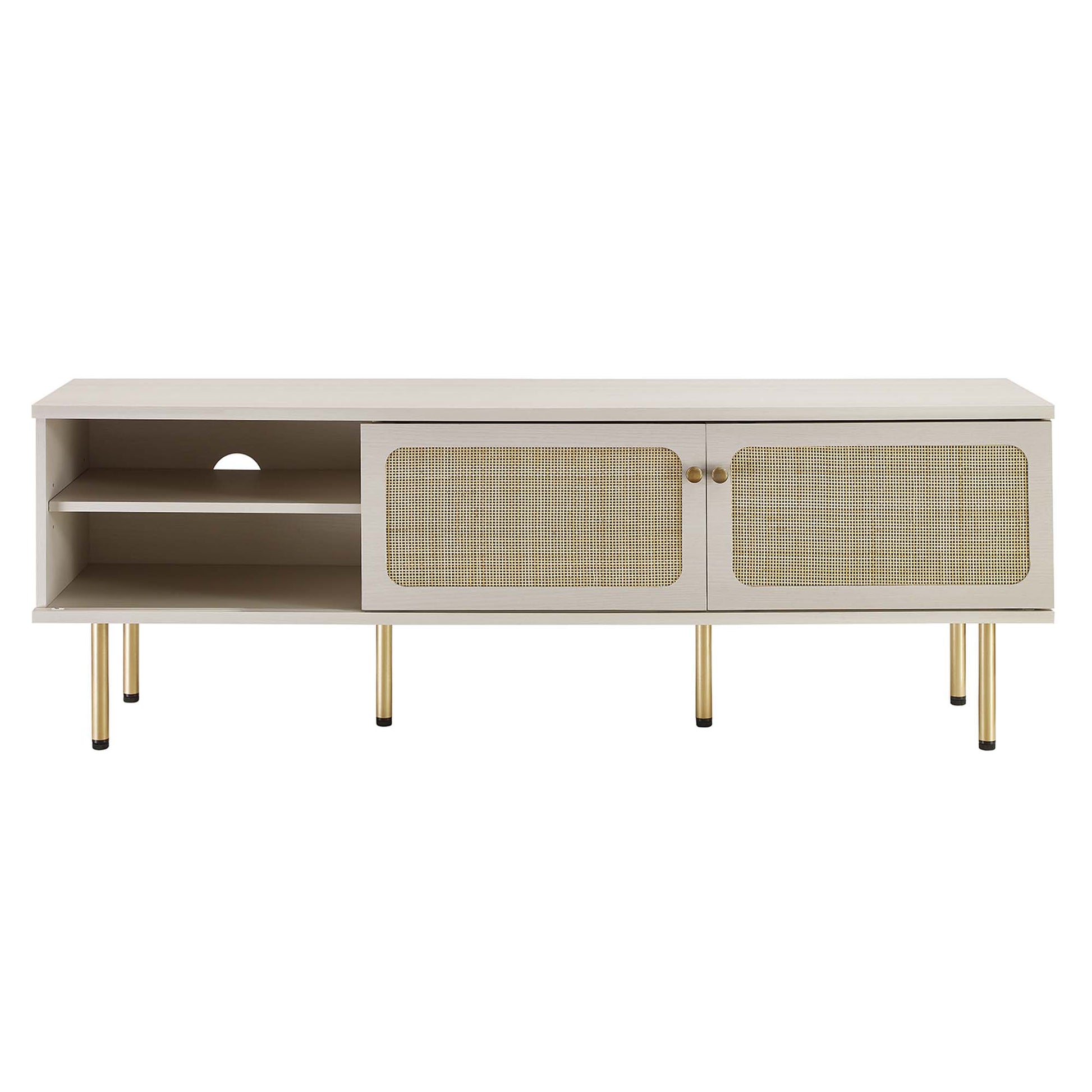 Use:Bring trending organic aesthetics to your living space with the Cambria TV Stand. This entertainment center rests on cylindrical metal legs with non-marking foot caps and features a natural rattan weave along the front of two sliding doors that partially conceal the shelving area. A versatile addition to a living room, bedroom, home office, or lounge area, this media console is crafted with durable particleboard and features three cable management holes that also allow for flow-through ventilation. Keep visual space clean with the ample storage space for media essentials. This entertainment stand accommodates flat screen TVs up to 66". Assembly required. Weight Limit: 189 lbs.,Modern TV Stand