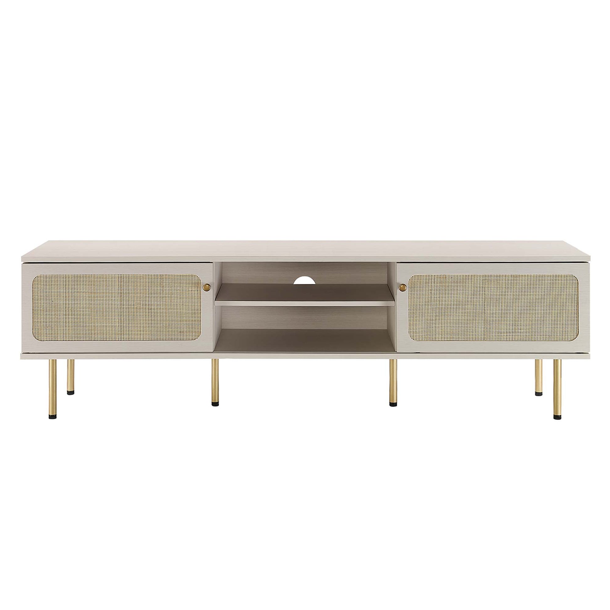 Use:Bring trending organic aesthetics to your living space with the Cambria TV Stand. This entertainment center rests on cylindrical metal legs with non-marking foot caps and features a natural rattan weave along the front of two sliding doors that partially conceal the shelving area. A versatile addition to a living room, bedroom, home office, or lounge area, this media console is crafted with durable particleboard and features three cable management holes that also allow for flow-through ventilation. Keep visual space clean with the ample storage space for media essentials. This entertainment stand accommodates flat screen TVs up to 76". Assembly required. Weight Limit: 220 lbs.,Modern TV Stand