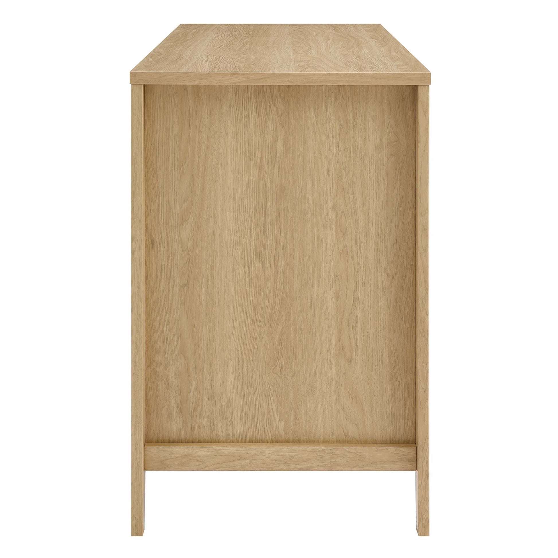Use:Introduce refreshing style to your workplace with the Soma 47" Office Desk. Showcasing a beautiful rattan weave on the door front of the shelved storage area, this computer desk brings organic aesthetics and modern functionality to the office, lounge area, apartment, college dorm room, or other workspace. This writing desk is crafted from durable MDF and particleboard with a natural wood grain finish. This home office desk is complete with a slide-out keyboard tray and a concealed storage area to keep visual space clean and office essentials neat and organized. Includes non-marking foot pads to protect flooring. Assembly required. Tabletop Weight Capacity: 200 lbs.