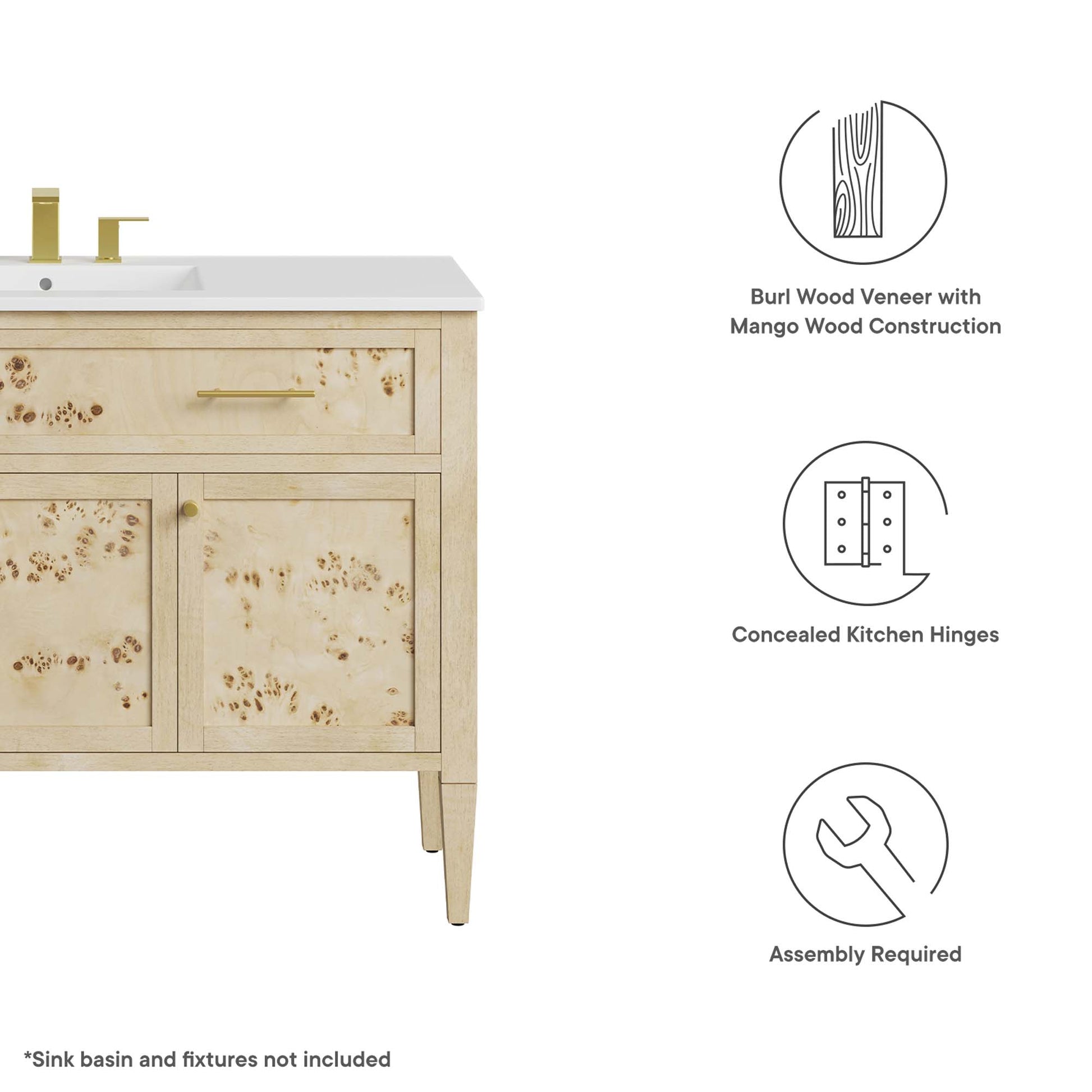 Use:Discover the epitome of organic aesthetics and practicality with the Elysian 48" Burl Wood Bathroom Vanity Cabinet. Designed for use as both a single or double sink vanity, this vanity cabinet is uniquely crafted from exquisite mango wood, further adorned with a rich burl wood veneer, radiating a distinctive charm and character. A fixed top drawer and tapered wood legs add to the sleek design, while the spacious shelving beneath?complete with a convenient plumbing cutout?offers ample storage space for all your bathroom essentials. While assembly is required, this vanity includes easy-to-follow assembly instructions. Sink basin and fixtures not included.