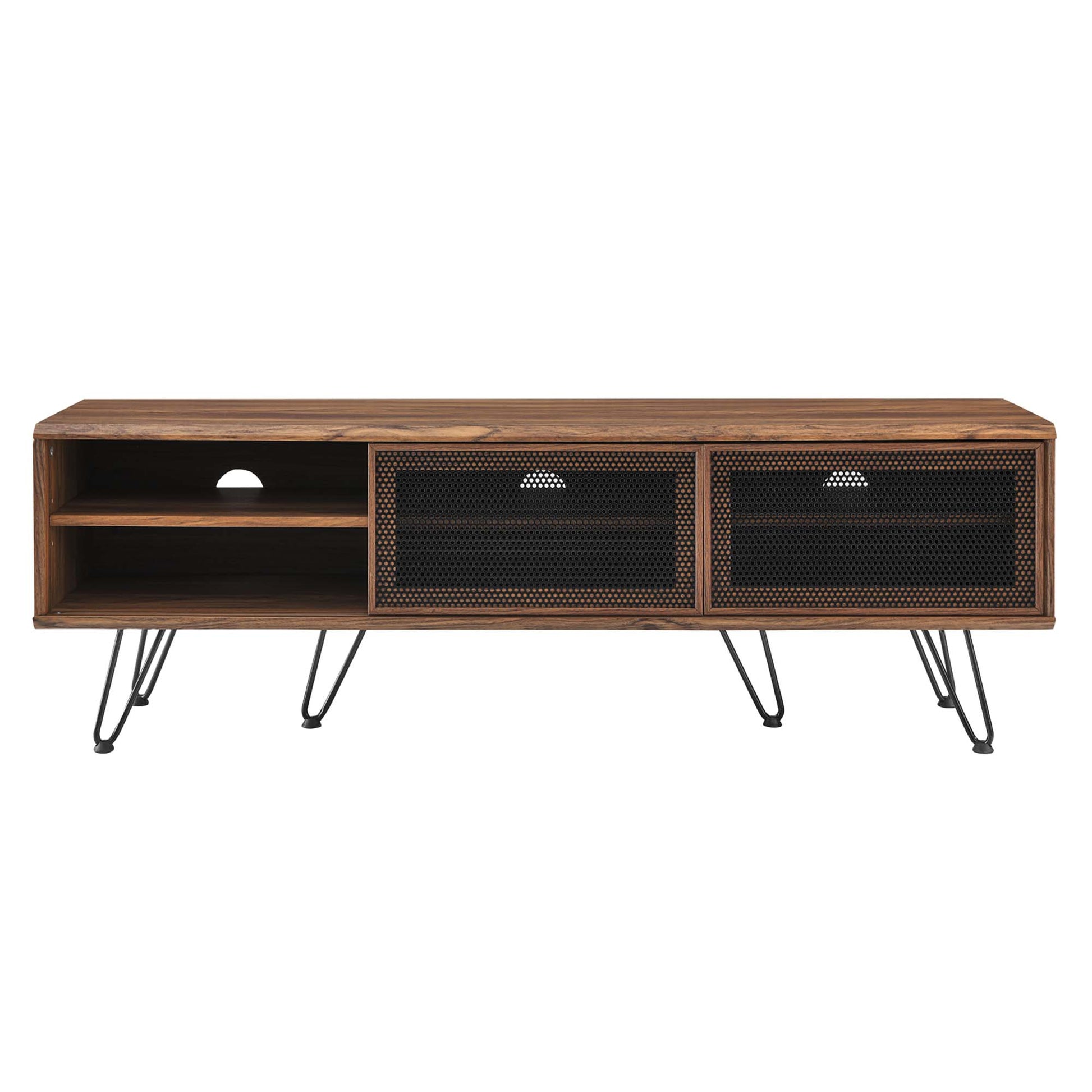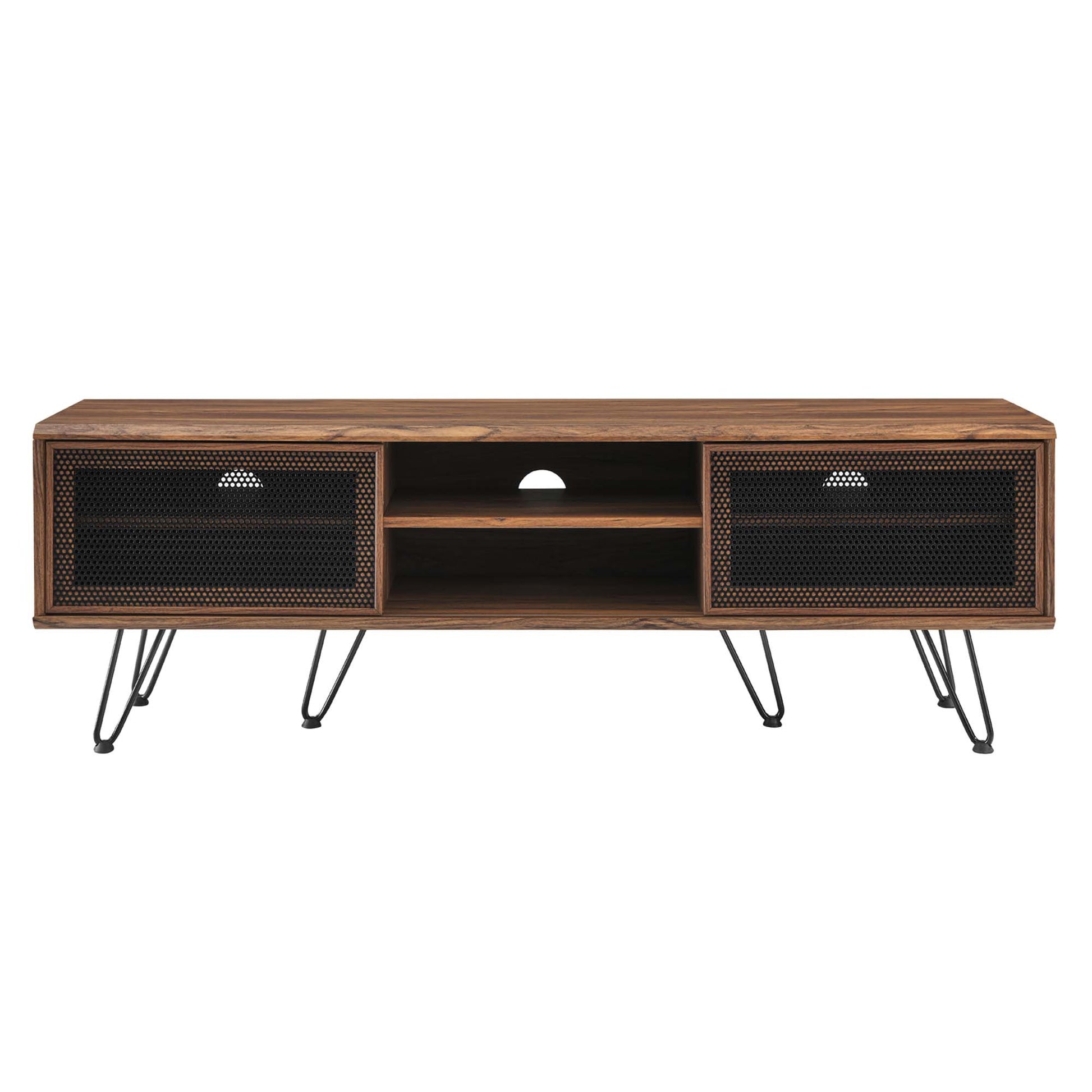 Use:Urbanize your living space with the modern style of the Nomad 59" TV Stand. Featuring two sliding metal mesh doors, this entertainment center brings organic aesthetics and industrial design to the living room, bedroom, home office, or lounge area. This media stand is crafted with a honeycomb core and wood grain laminate. Resting on splayed hairpin legs with non-marking rubber pads, this media stand offers ample storage space for all your media essentials with spacious shelving while cable management holes keep visual space clean and allow for flow-through ventilation. This TV center accommodates TVs up to 65". Assembly required. Weight Capacity: 200 lbs.