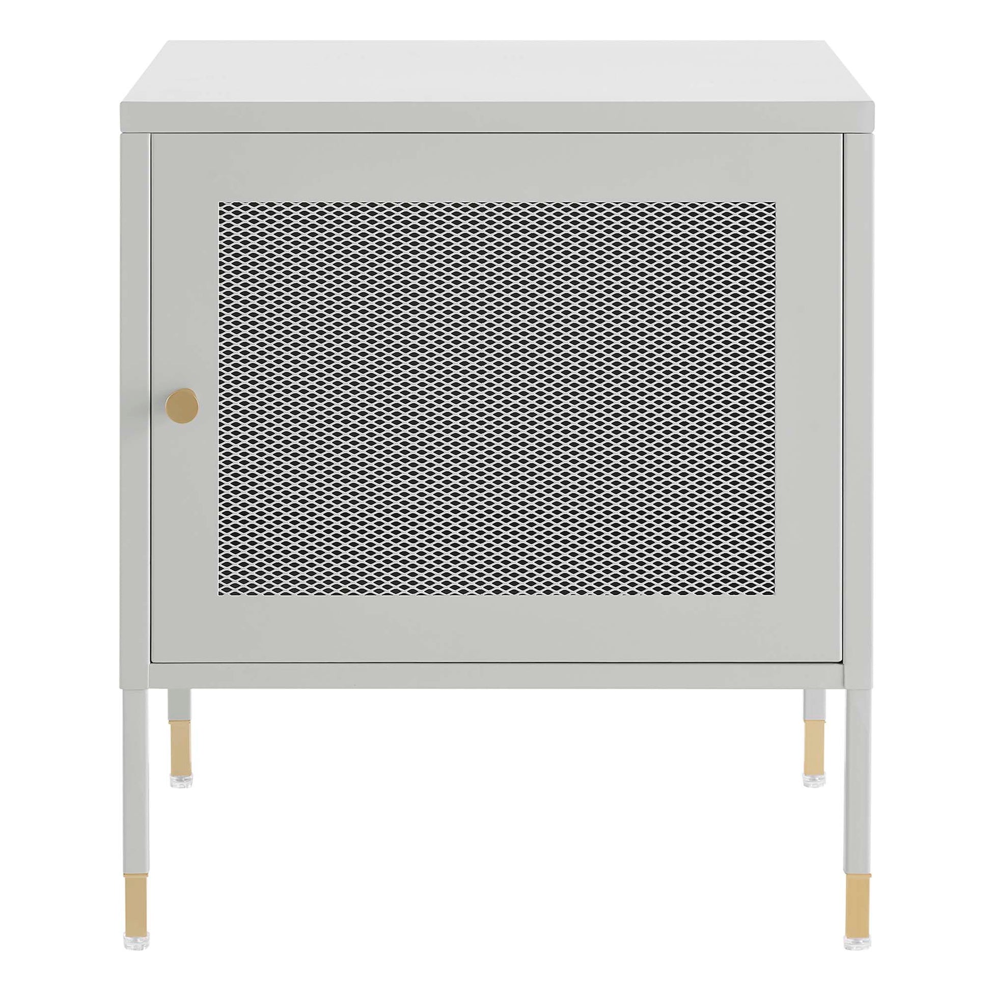 Use:Elevate your bedroom decor and storage needs with the Covelo Nightstand. Crafted with durable cold-rolled steel plates with powder-coated paint, this bedside table is built to last. The copper-plated zinc alloy handle pull and mesh-front door adds a touch of elegance and modern interest to its surroundings. On the inside of this nightstand, you'll find a spacious open storage area behind a magnet close door. Anti-tipping hardware is included for added safety. The adjustable foot pads protect your flooring from scratches and damage while ensuring stability. Perfect for the primary or guest bedroom or even as a side table in a living space, our accent table offers stylish and functional storage space to suit your needs. Assembly required.,Modern Nightstand