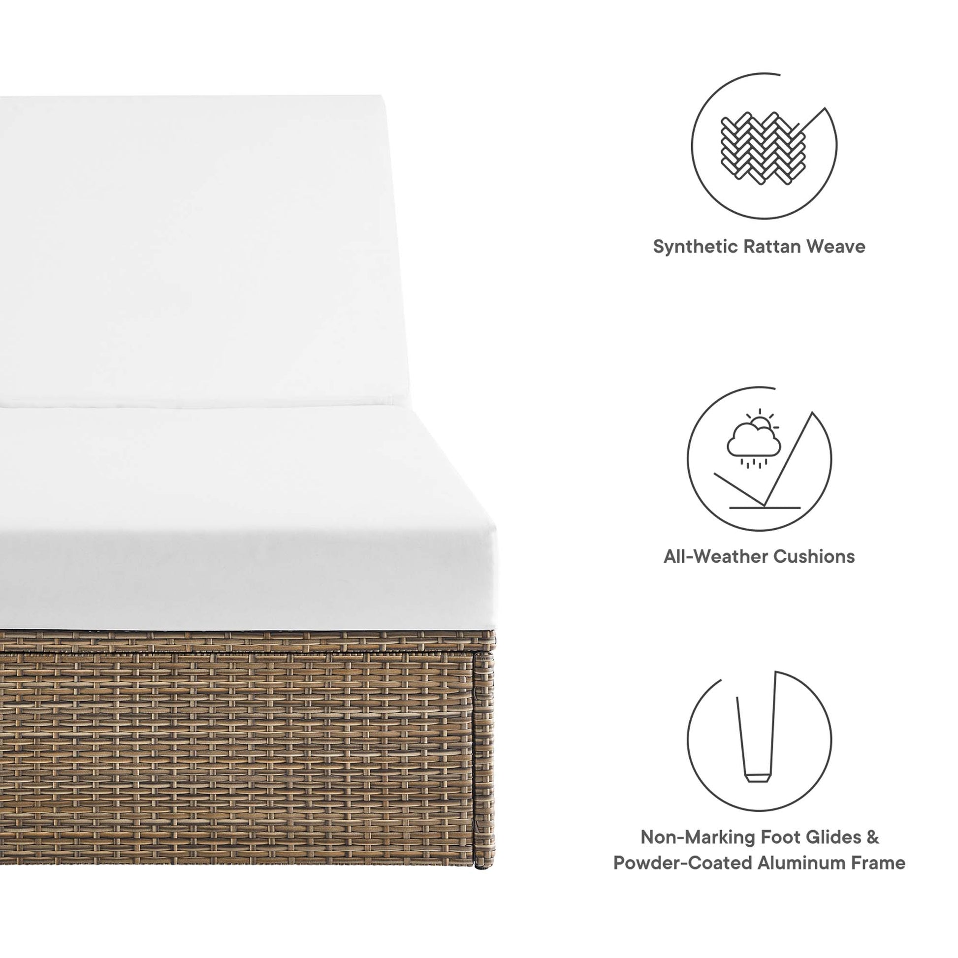 Use:Surround yourself with warm weather and good company with the Convene Outdoor Collection. Made with synthetic rattan weave and a powder-coated aluminum frame, this outdoor chaise lounge leaves a positive impression on your guests while enhancing your patio, backyard, porch, or poolside with modern style and appreciated texture. A lasting all-weather addition to your outdoor space, this outdoor lounge chair is complete with dense foam padded cushions with water-resistant zippered covers and non-marking foot pads to protect your flooring. Assembly required. Easy to follow instructions included. Weight Capacity: 330 lbs.