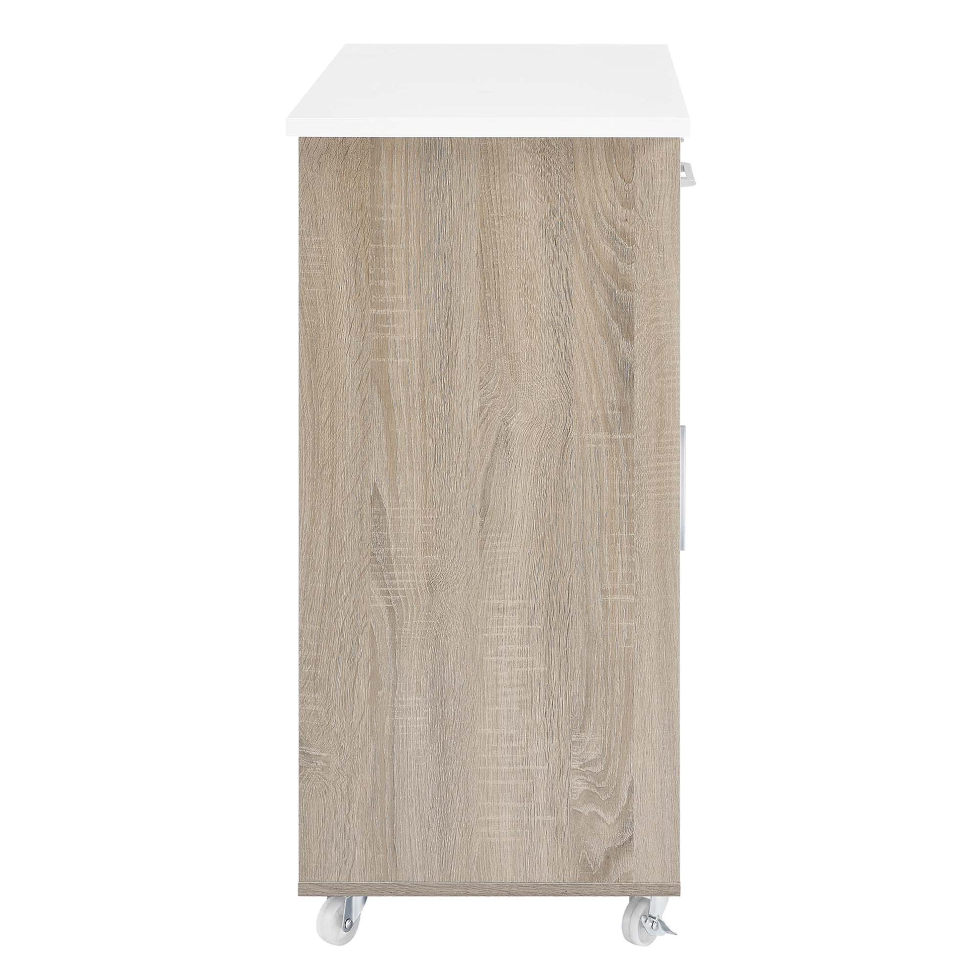 Use:Experience the perfect blend of functionality and elegance with the Culinary Kitchen Cart. Crafted with particleboard and adorned with a beautiful paper laminate, this kitchen island cart brings a natural aesthetic to your home or apartment. Equipped with four nylon casters with side lock brakes, this rolling cart glides effortlessly wherever you need it. Set up a coffee nook or organize your kitchen essentials using its two full-glide drawers, two open shelves, and two storage shelves tucked neatly behind an elegantly hinged glass-front door. From small appliances to pots, pans, and cooking utensils, this kitchen cart with wheels provides ample storage space to keep your kitchen neat and tidy and even includes a convenient spice rack on its side. The Culinary Coffee Bar Cabinet is a versatile small kitchen island that complements modern kitchen furniture and decor. Assembly required. Tabletop Weight Capacity: 276 lbs; Shelf Weight Capacity: 44 lbs.,Modern Kitchen Cart