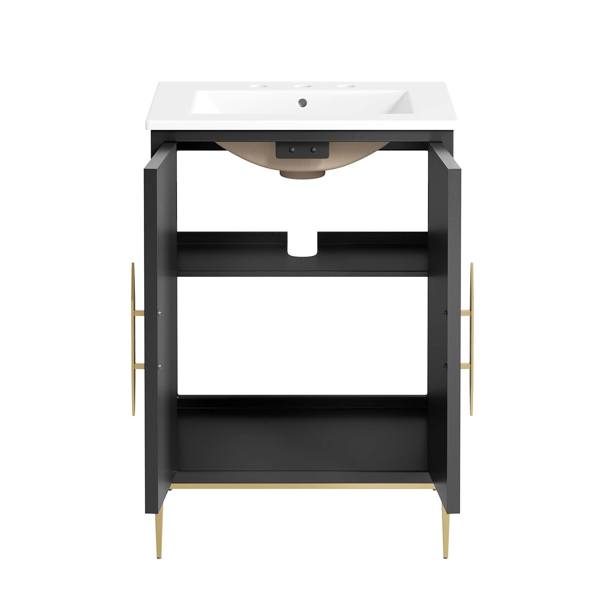 Use:Intricate modernity radiates into your bathroom space with the Awaken 24" Bathroom Vanity. Showcasing clean lines arranged in a radial formation, this bathroom vanity is crafted with solid wood and MDF and rests on a gold base with non-marking foot pads to protect flooring. This vanity is a complete addition to a bathroom with a ceramic sink basin with an integrated countertop and 8" centerset holes. Offering ample storage space for bathroom essentials and more, this vanity cabinet features spacious shelves hidden behind detailed doors with sleek gold hardware. Fixtures not included. Assembly required.