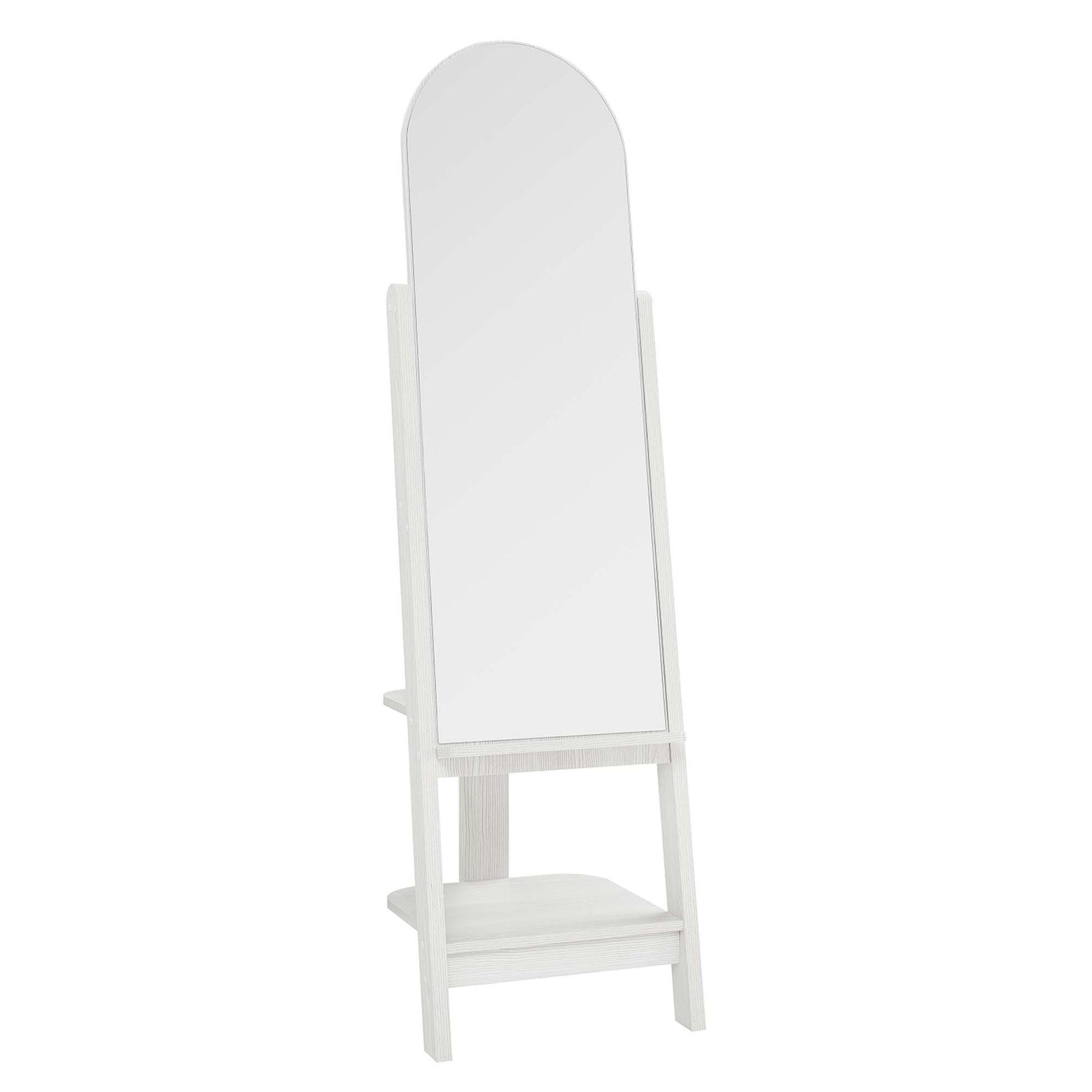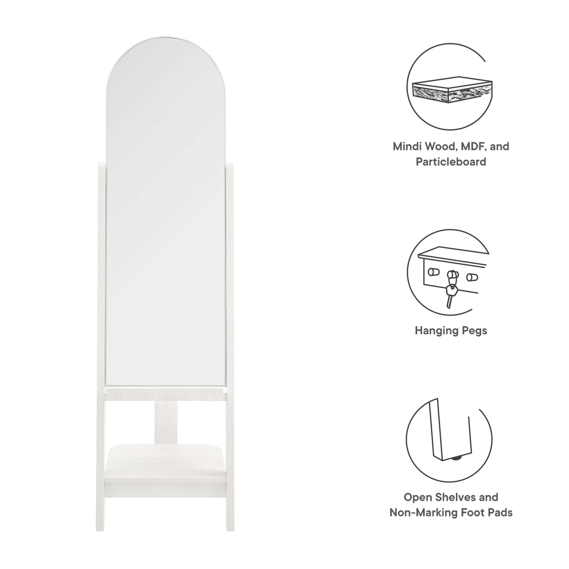 Use:Brighten up any room with the Ascend Standing Mirror. Featuring a curved glass mirror with an arched shape, this easel mirror is crafted from a combination of mindi wood, MDF, and particleboard with a beautiful wood grain laminate. It's versatile design boasts a shallow shelf under the mirror and two open shelves for either storage or display, while three clothing pegs offer functional hanging space. Appraise outfit selections on your way out the door with this stylish addition to a bedroom, living room, entryway, or other living space. Easy to follow assembly instructions included.,Arched Standing Mirror