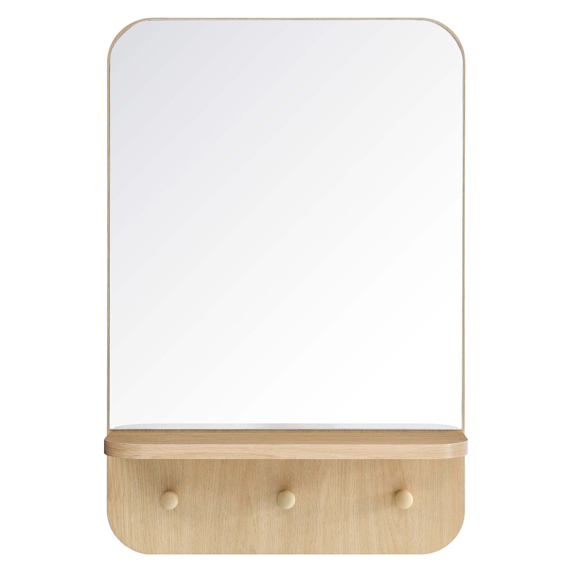 Use:As stylish as it is functional, the Lumina Mirror features rounded corners, a rectangular profile, small shelf, and three pegs making it a must-have for the entryway, hallway, or mudroom. Bringing a touch of modern style and elegance to your space, this mirror offers organization and storage for keys, dog leashes, hats, and a variety of other small items. Crafted from mindi wood and particleboard with a wood grain laminate, this all-in-one mirror is made to last and offers a charismatic touch to any home or apartment. Its sleek, modern design and wood grain aesthetics are sure to turn heads and make a statement. Minimal assembly required.