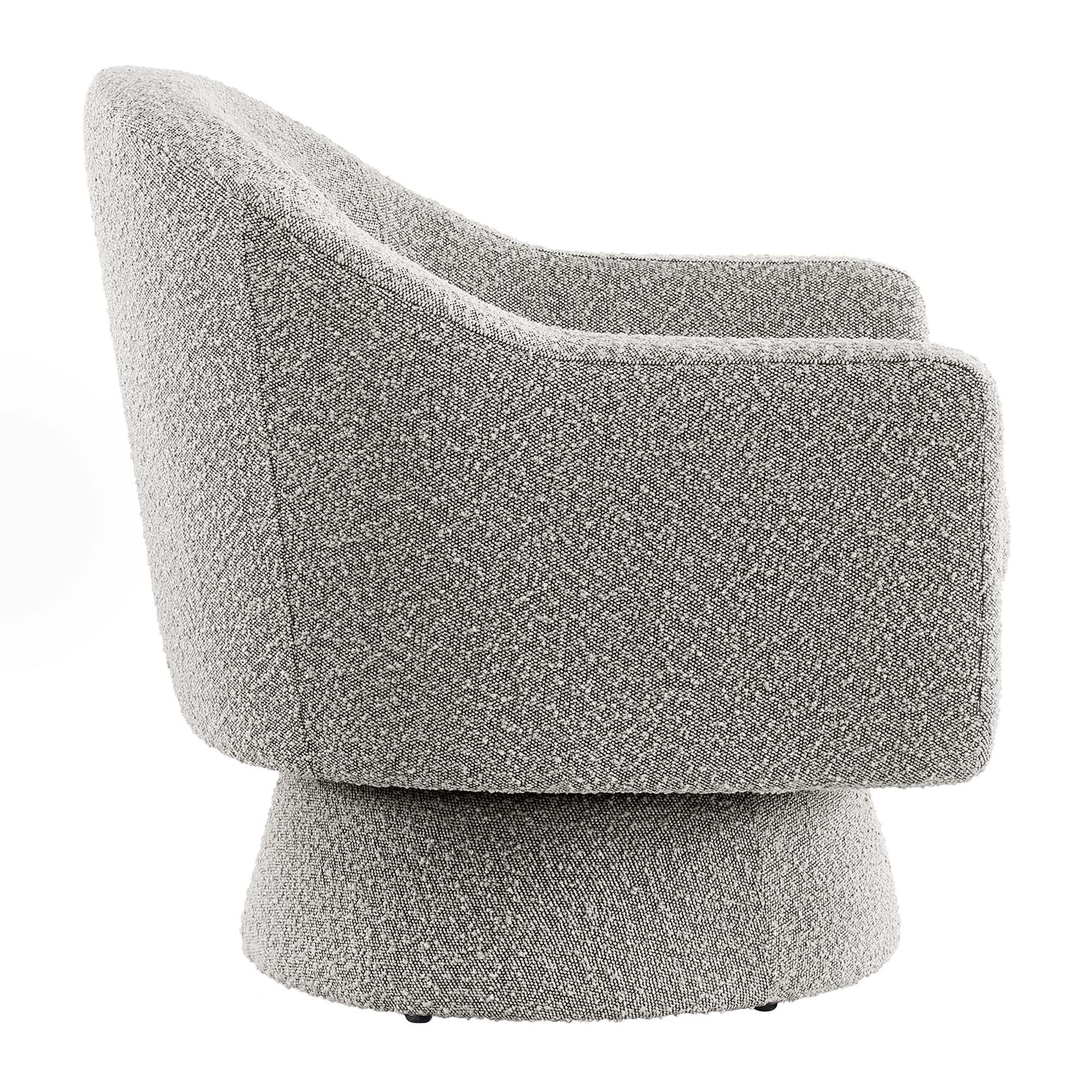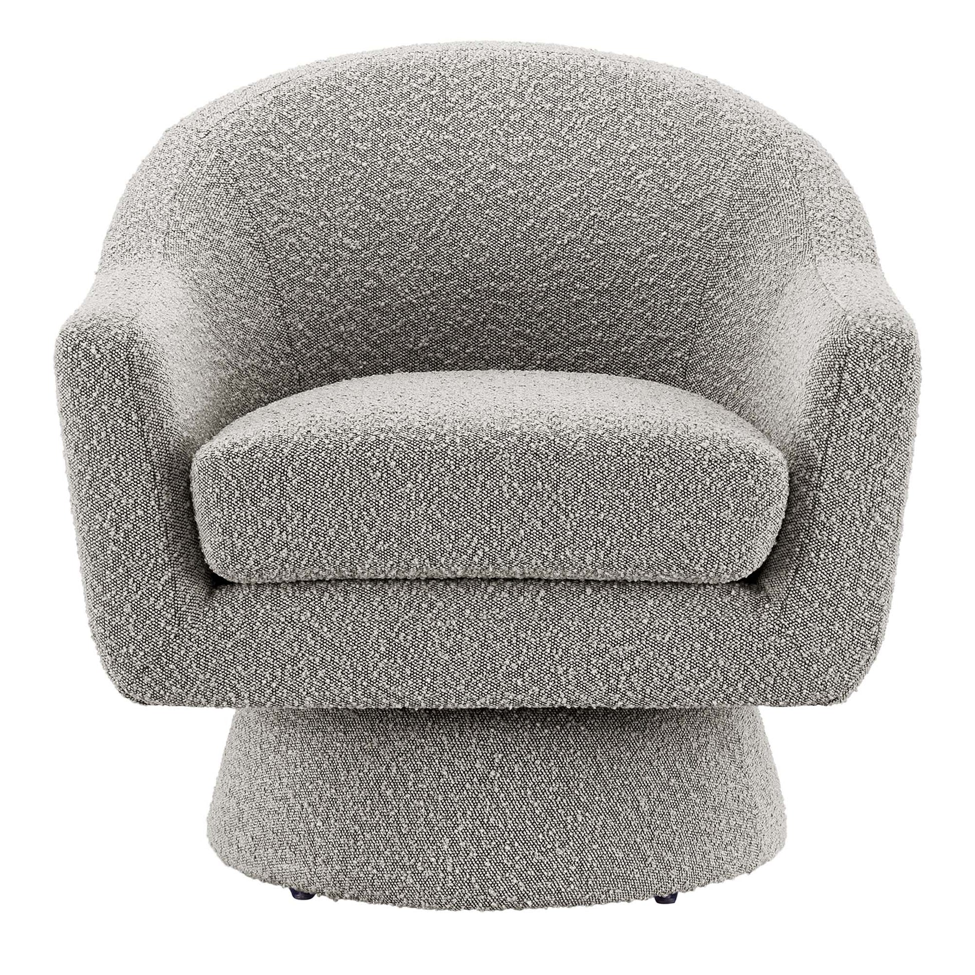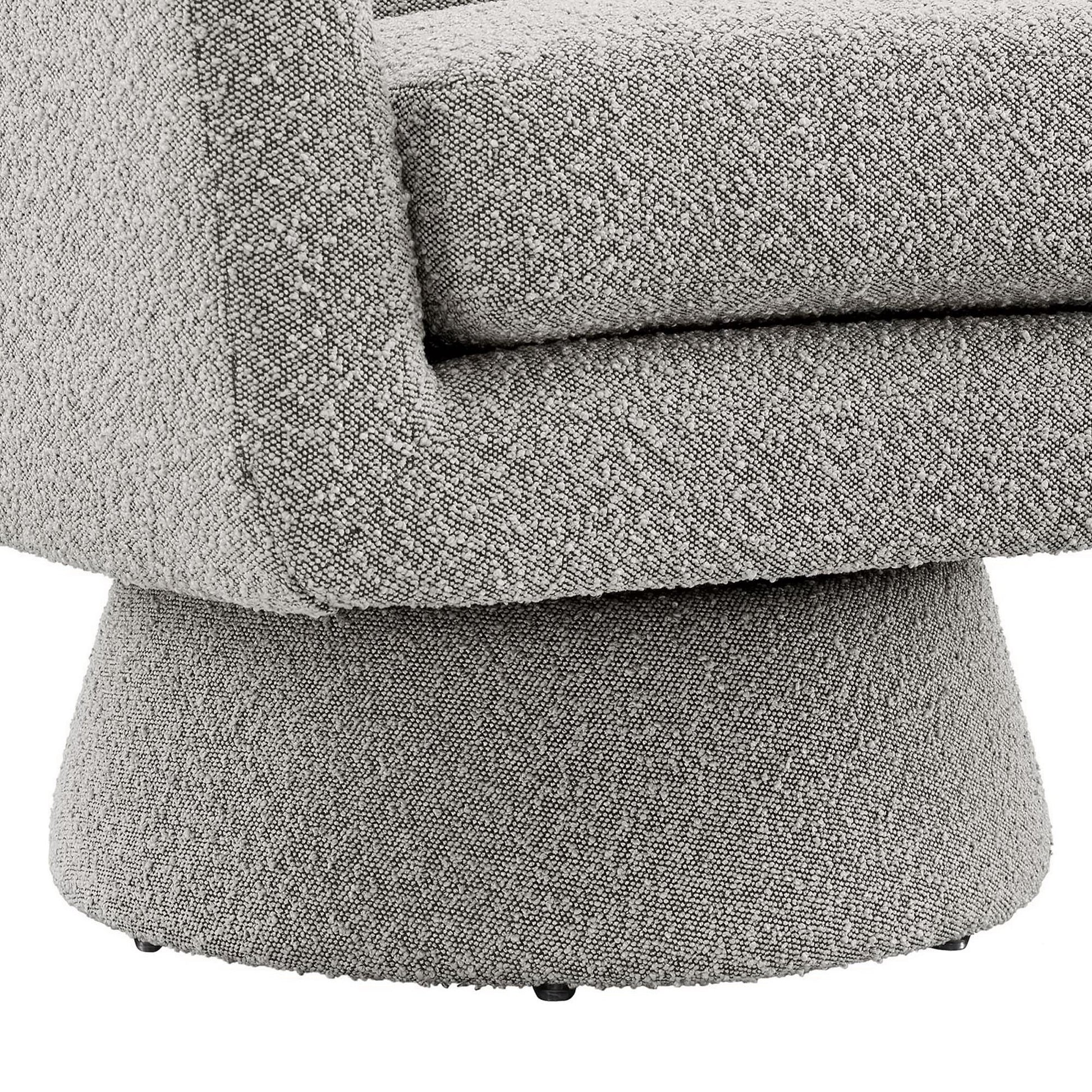 Use:Initiate charming texture and a modern silhouette to your living room, bedroom, office, or other seating areas with the Astral Boucle Swivel Chair. Boasting sweeping armrests and a tailored profile, this accent chair is upholstered in boucle fabric that boasts a beautiful nubby texture. Dense foam pads the chair and the removable seat cushion to offer a premium seating experience. Suiting the needs of any moment, this upholstered chair rests on a tapered base complete with 360?? swivel. Includes non-marking foot pins to protect flooring. Minimal assembly required. Weight Capacity: 330 lbs.