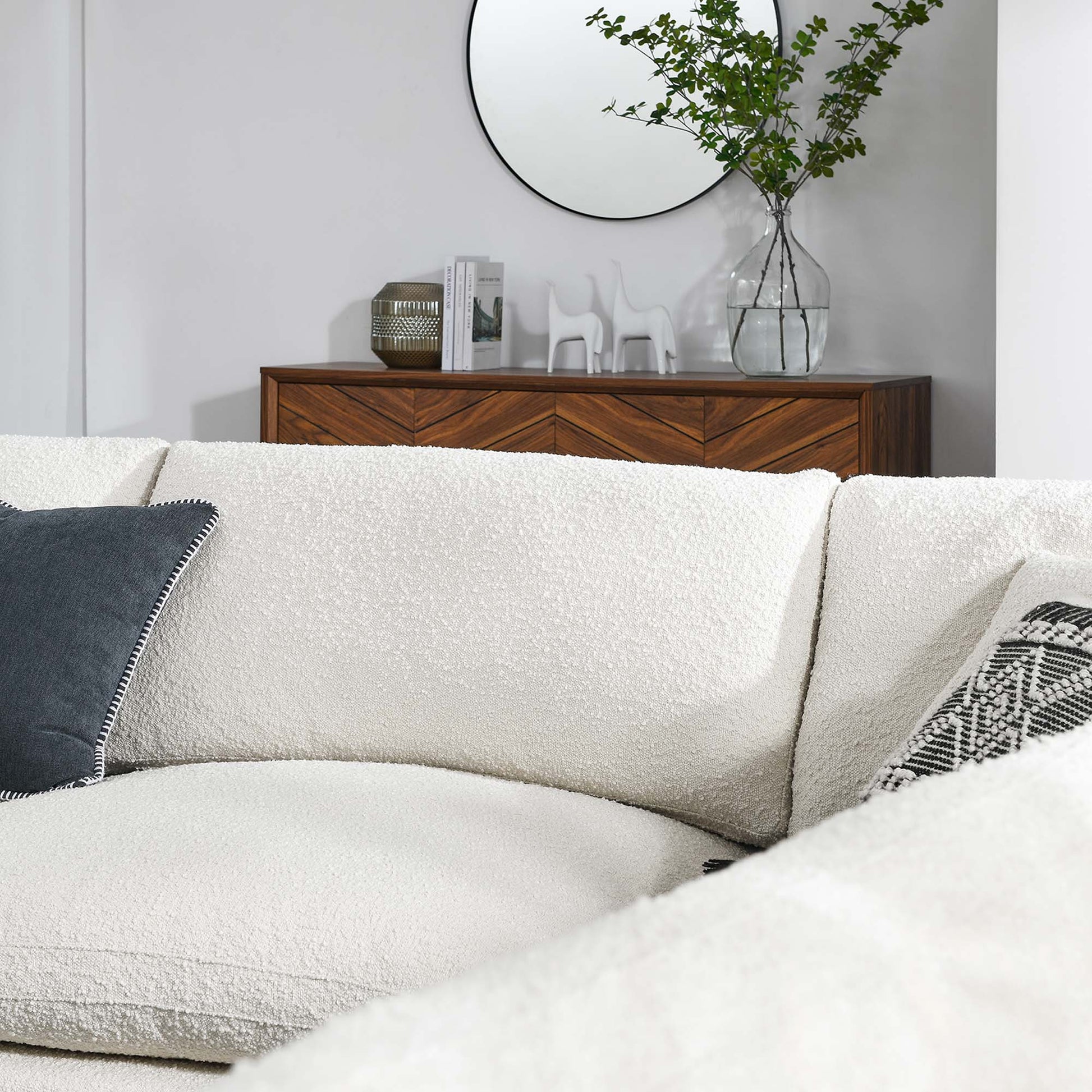 Use:A haven for cozy relaxation, Commix features plush comfort and a clean-lined design. The spacious profile makes an attractive statement in the modern home. Covered in a boucle fabric with a charming nubby texture, this upholstered sectional sofa comes with a solid wood construction and foam padded and duck down cushions for a luxurious sink-in feel. Commix features overstuffed down feather cushions that offer a feeling of relaxation and calming comfort while lounging, making it the perfect addition to the living room, family room, or game room. Made for sprawling out or curling up, Commix beckons you and guests to sit and stay a while. Includes plastic foot glides. Weight Capacity of Each Piece: 331 lbs.