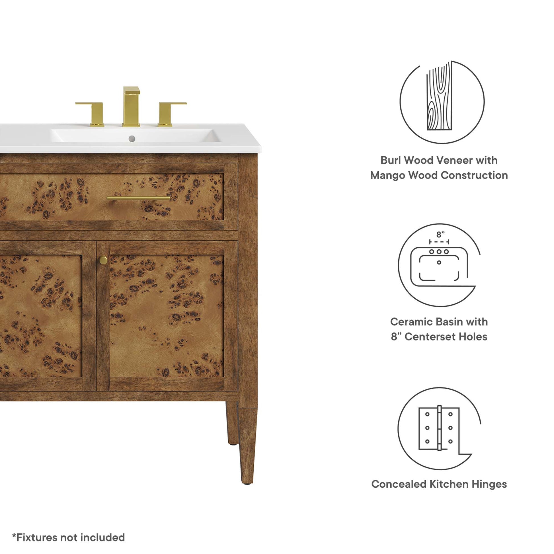 Use:Discover the epitome of organic aesthetics and practicality with the Elysian 48" Burl Wood Double Sink Bathroom Vanity. Each vanity cabinet is uniquely crafted from exquisite mango wood, further adorned with a rich burl wood veneer, radiating a distinctive charm and character. This bathroom vanity's centerpiece is an elegant ceramic double sink basin, thoughtfully designed with an integrated countertop and 8" centerset holes ready for your choice of fixtures (not included). A fixed top drawer and tapered wood legs add to the sleek design, while the spacious shelving beneath?complete with a convenient plumbing cutout?offers ample storage space for all your bathroom essentials. While assembly is required, this vanity includes easy-to-follow assembly instructions.