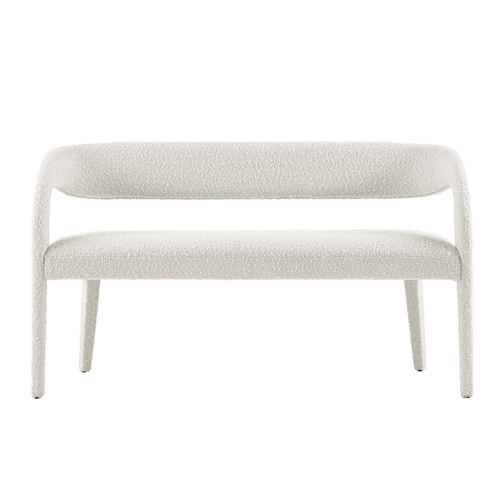 Use:Experience the perfect blend of modern sophistication and luxurious comfort with the Pinnacle Boucle Fabric Upholstered Accent Bench. Whether used as a dining bench or accent bench, its distinct silhouette showcases a curved backrest and an open design that effortlessly enhances your dining or living space with luxe style. This modern bench indulges your senses with its dense foam padding, upholstered in a tactile, nubby textured boucle fabric. Non-marking plastic foot pins ensure your flooring remains free from scuffs and scratches. With no assembly required, this bench offers a stylish statement instantly. Weight Capacity: 330 lbs.