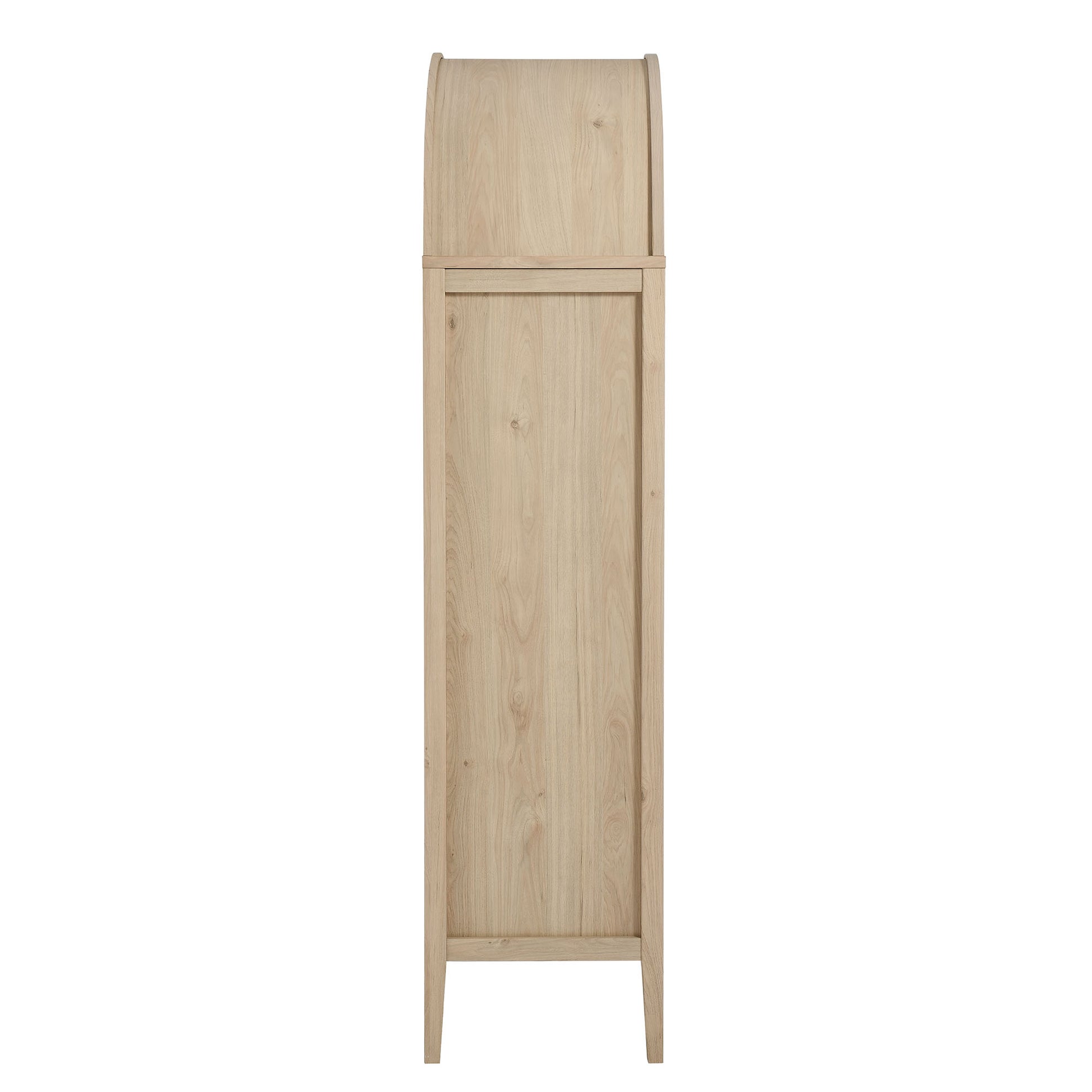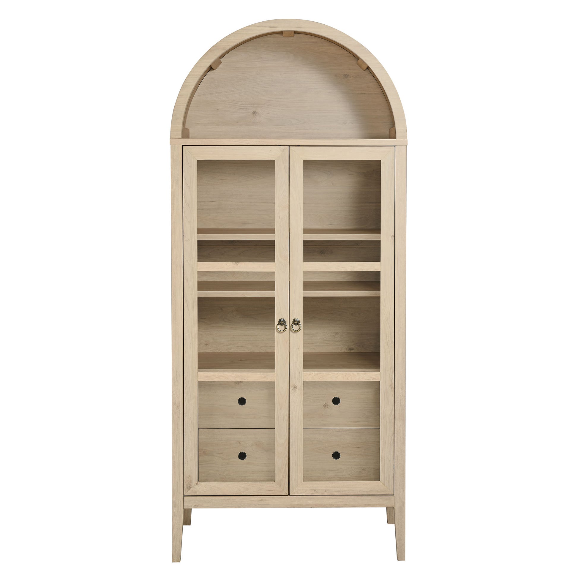 Use:The Nolan Display Cabinet combines functional storage versatility with charming modern farmhouse style. Crafted from MDF and particleboard, the chic design flaunts wood grain laminate, edge trimming, and an elegantly rounded arched top shelf. Supported by tapered wood legs, the Nolan tall storage cabinet boasts two doors with tempered glass windows that provide an open view to its interior. Inside the arched cabinet you?ll find two adjustable shelves, a fixed shelf, and two roomy full-glide drawers, offering plenty of storage space for displaying decorative items or for tucking away odds and ends. Complete with soft-close hinges and metal ring pull handles with a brushed gold finish, this wood storage cabinet is as stylish as it is practical. Perfect for your living room, hallway, or dining area, this arched bookcase effortlessly adds an air of sophistication and vintage allure to your home. To protect your flooring, this tall storage cabinet with doors comes equipped with non-marking foot pads. Assembly required. Weight Capacity: Arched Shelf: 88 lbs, Adjustable Shelves: 70 lbs, Fixed Shelf: 62 lbs, Drawers: 22 lbs