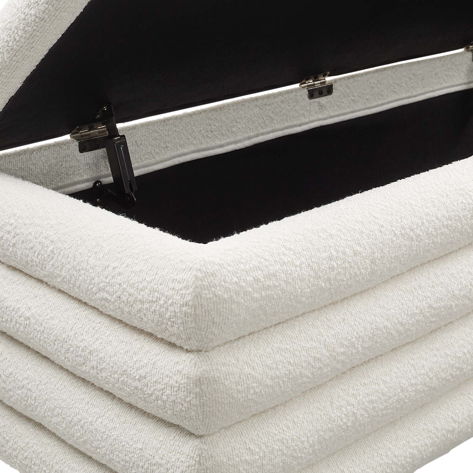 Use:Elevate your home?s comfort and elegance with the Mezzo Boucle Upholstered Storage Ottoman. Padded with dense foam and wrapped in a nubby textured boucle fabric, this storage bench for the living room or bedroom is as practical as it is striking with its plush channel tufted detail. The stay-open hinge adds convenience, revealing a spacious storage area ideal for stowing linens, games, home accents, and more. Perfectly suited as a storage bench for the entryway or as a chic bed bench, Mezzo offers versatile use with its non-marking floor glides to protect your surfaces. Its robust design, coupled with the nubby texture of boucle, makes it a centerpiece in any room. Arriving fully assembled, this bedroom bench saves you time and effort, allowing you to instantly enjoy its splendor and spacious utility. Weight Capacity: 617 lbs.