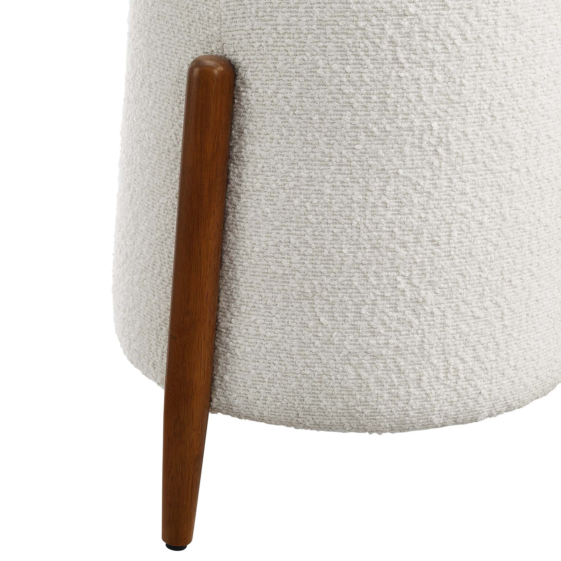 Use:Immerse your living space in the sophisticated comfort of the Riven Ottoman. Upholstered in textured boucle fabric, this foam-padded, round ottoman stool radiates an air of elegance with a hint of modern panache. With its gentle curves and soft silhouette, this foot pouf ottoman stands on three tapered wood legs, elegantly affixed to the exterior of the footrest, providing a stable foundation while enhancing the piece?s overall shape with their sleek, splayed design. Whether it's accompanying your favorite armchair as a charming ottoman side table, used as an elegant vanity stool, or acting as a decorative ottoman in your living room, Riven's petite stature is designed to fit into any decor, offering a multifunctional ottoman for everyday needs. Celebrate the seamless blend of texture and form with this exquisite boucle ottoman, bound to become a cherished addition to your home furniture collection. Assembly Required. Weight Capacity: 264 lbs.