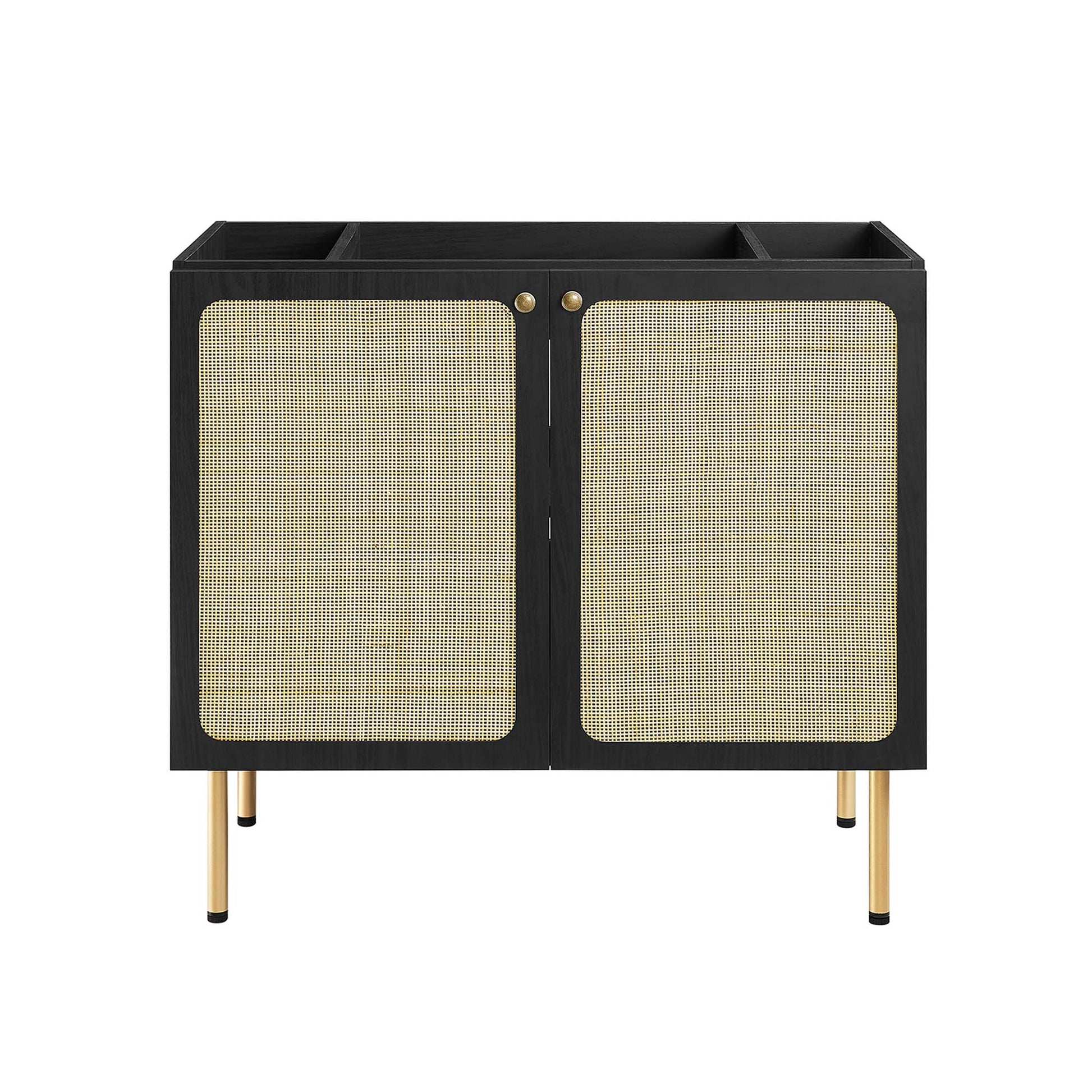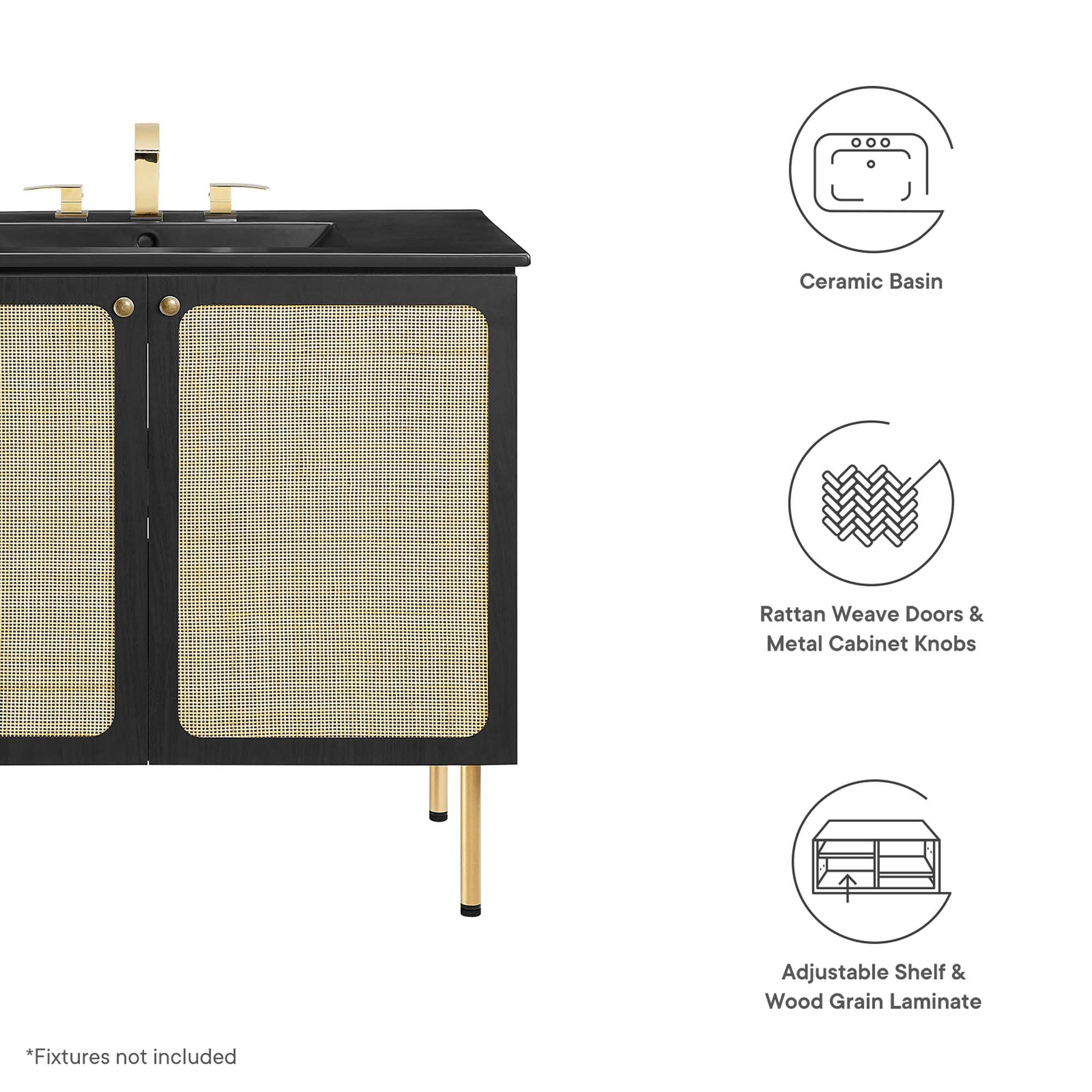 Use:Refresh your washroom with the textured detail of the Chaucer 36" Bathroom Vanity. Featuring beautiful rattan weaving on its doors, this vanity cabinet instantly updates any bathroom or powder room. A spacious adjustable top shelf and a fixed bottom shelf hidden behind its hinged doors offers ample storage space for toiletries, towels, and other bathroom essentials. With a ceramic basin with 8" centerset holes and an integrated countertop, this vanity?s design highlights its sleek countertop for an added touch of elegance. Enriched by stylish round metal cabinet knobs and resting on sleek legs with adjustable feet for added stability, this bathroom cabinet is durably crafted with MDF, particleboard, and wood grain laminate to bring natural organic aesthetics to your decor. Assembly required. Fixtures not included. Top Shelf Weight Capacity: 48 lbs. Bottom Shelf Weight Capacity: 99 lbs.,MDF and Particleboard