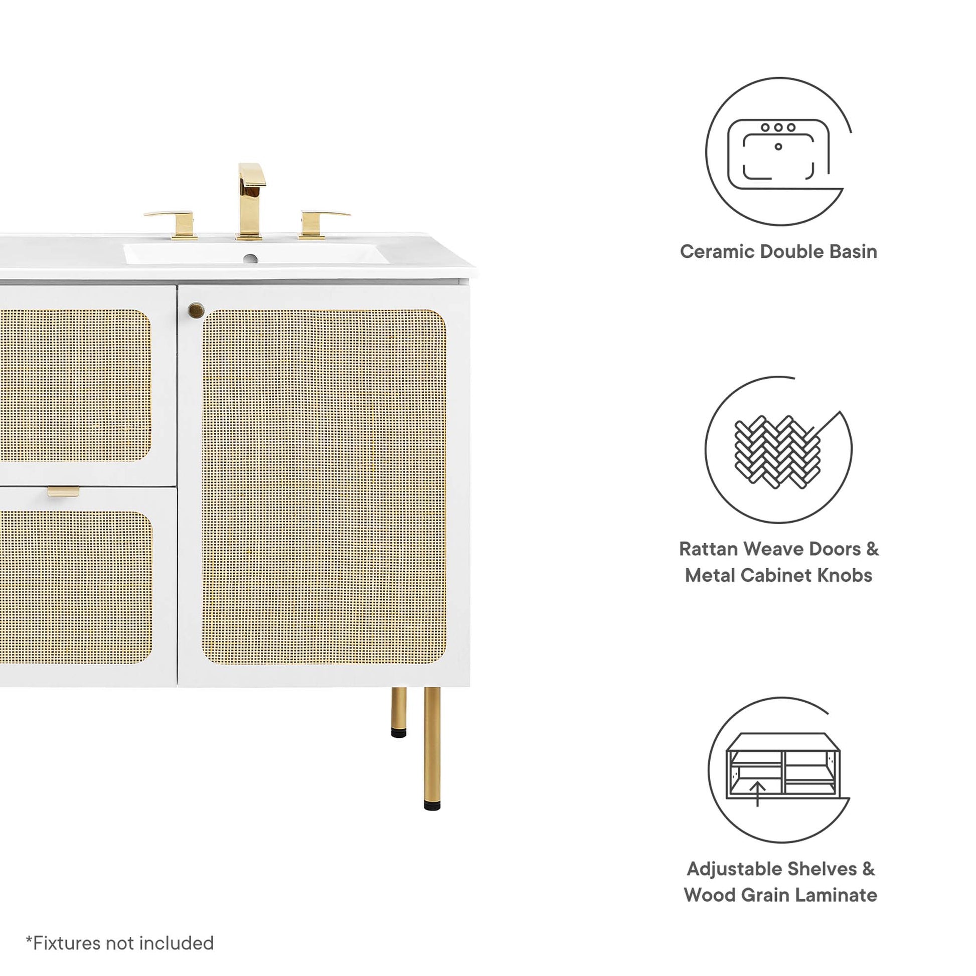 Use:Refresh your washroom with the textured detail of the Chaucer 48" Double Basin Bathroom Vanity. Featuring beautiful rattan weaving on its doors, this vanity cabinet instantly updates any bathroom or powder room. A spacious bottom drawer and a decorative top drawer sit between two hinged doors, each opening to reveal an adjustable top shelf and a fixed bottom shelf, offering ample storage space for toiletries, towels, and other bathroom essentials. With a ceramic double basin with 8" centerset holes and an integrated countertop, this vanity?s design highlights its sleek and spacious countertop for an added touch of elegance. Enriched by stylish round metal cabinet knobs on its cabinet doors and a finger edge pull handle on its drawer, this vanity rests on sleek legs with adjustable feet for added stability. Durably crafted with MDF, particleboard, and wood grain laminate this bathroom vanity washbasin brings natural organic aesthetics to your decor. Assembly required. Fixtures not included. Top Shelf Weight Capacity: 24 lbs. Bottom Shelf Weight Capacity: 46 lbs.,MDF and Particleboard