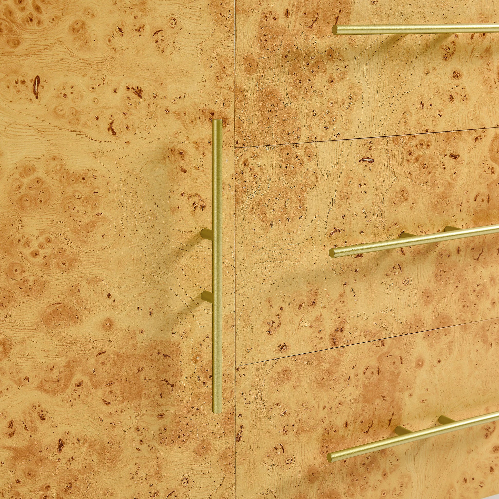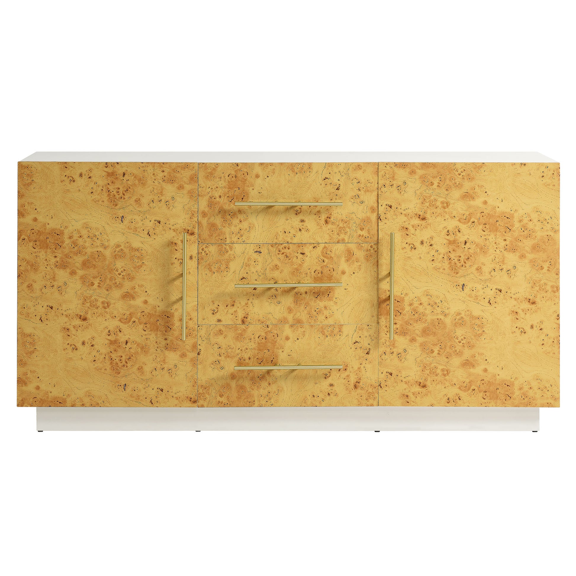 Use:Add a stylish 59 inch storage cabinet to your living room with the eye-catching Abel Burl Wood Sideboard. A perfect blend of mid-century modern design and practical storage, this sideboard cabinet with doors and drawers is crafted from durable particleboard and MDF. Featuring beautifully textured burl wood laminate on its door and drawer fronts, along with elegant gold-tone metal pulls, this sideboard buffet complements both modern and farmhouse-inspired interiors. With soft-close hinges, the two doors and three drawers of the Abel Cabinet Sideboard each open to reveal individual storage compartments, providing stylish storage - whether used in the living room as an entertainment cabinet for anchored or wall-mounted TVs, or as a sideboard buffet cabinet in your dining room. While its burl wood laminate adds a timeless, contemporary design, the spacious compartments of this wood credenza cabinet with drawers ensure your living room essentials are always within reach. Assembly required. Weight Capacity: 287 lbs.