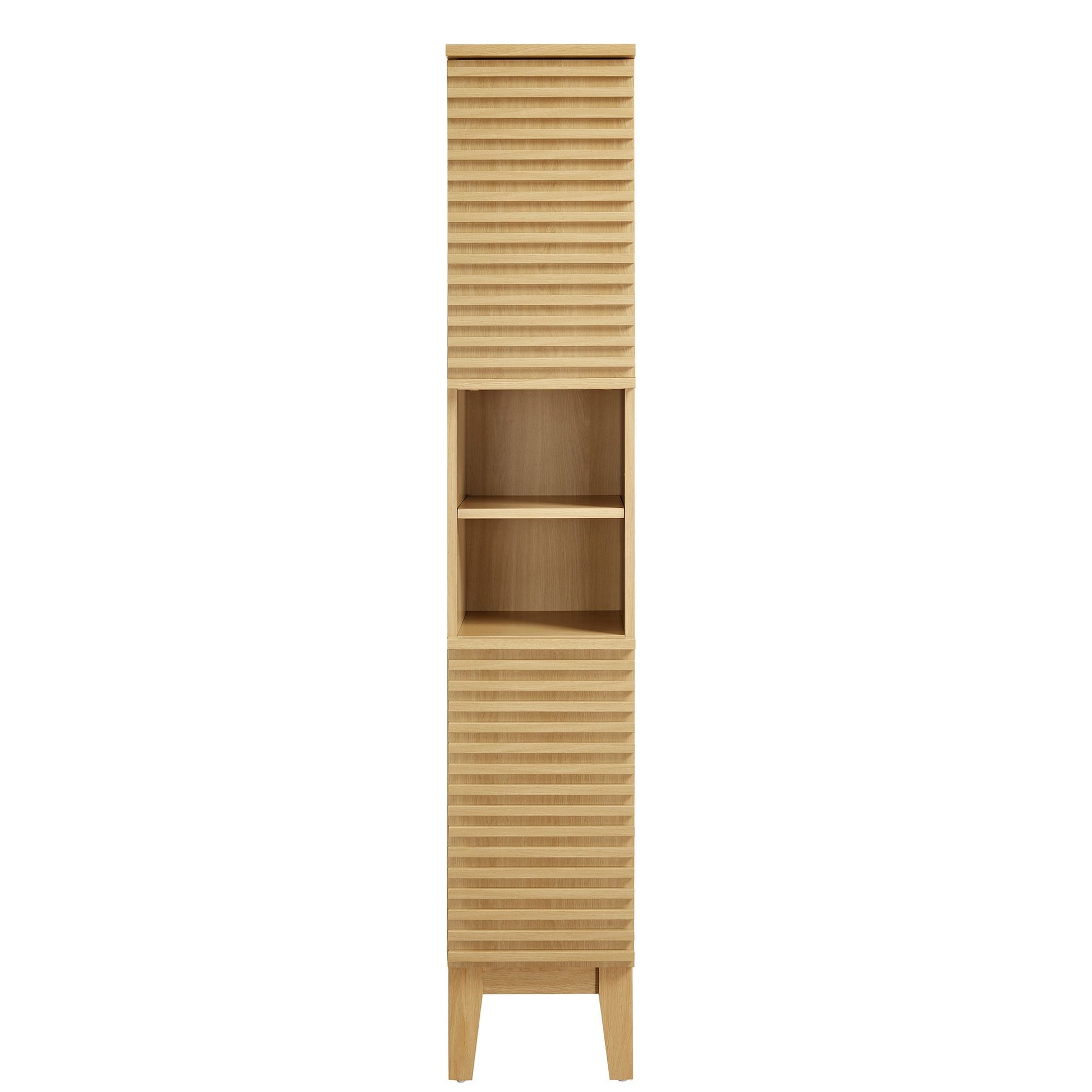 Use:Tap into mid-century aesthetics with the Render Bathroom Storage Cabinet. This 63-inch tall bathroom storage cabinet boasts two open shelves and two concealed storage areas behind soft-close hinged doors. Each door displays beautifully designed slatted details, creating sleek lines and a crisp look designed to bring modernity to your bathroom space. These doors open to reveal adjustable shelves within, offering a tailored storage solution. Matching the doors' modern aesthetic, the rest of the bathroom tower is just as thoughtfully designed, featuring a durable particleboard frame with smooth wood grain laminate and four tapered wood legs. Abounding in mid-century modern style, this tall bathroom storage cabinet with 2 doors offers a solid construction with a pleasing look and practical functionality perfect for storing towels, toilet paper, makeup, and other bathroom essentials. This linen cabinet includes non-marking floor glides to protect flooring. Assembly required.