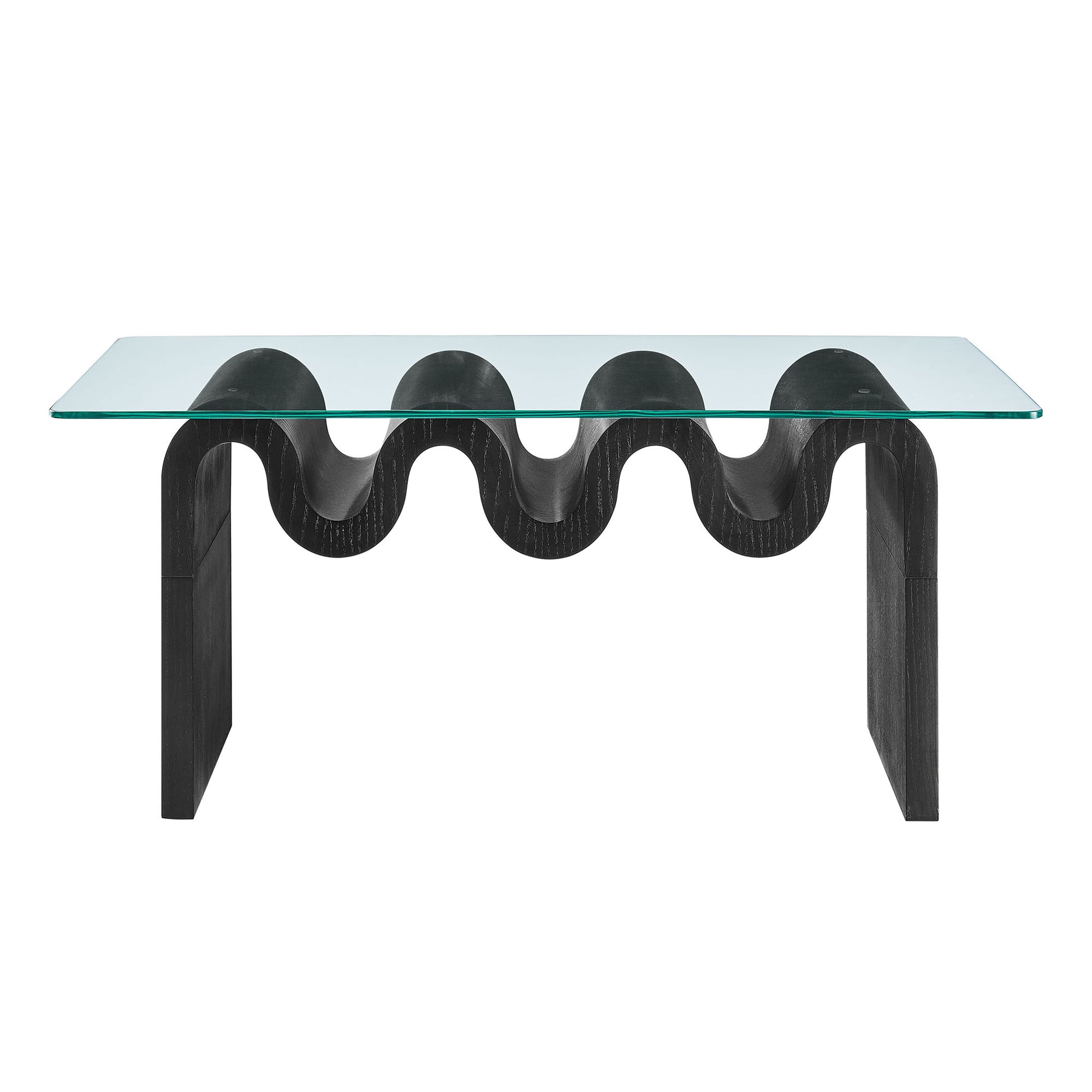 Use:The Ondine Glass and Wood Coffee Table stands out with its unique retro design, adding an artistic touch to any room. Its trendy frame, shaped in a bold wave-like form across the top, is crafted from durable materials and finished with a natural ash veneer, providing a rich, textured look, or a solid color finish to add some flair to your space. The squiggle-shaped foundation of this curved coffee table brings a sense of movement and fluidity, beautifully contrasted by the clear tempered glass top above it. The glass surface allows the wavy base to remain fully visible, making it the focal point of the design. The rounded edges on this glass top coffee table add softness to the overall aesthetic, while the clear plastic anti-skid grips offer stability to ensure the glass is secure. The Ondine glass wood coffee table is equipped with leveling, non-marking feet that keep the table securely in place without damaging your floors. Whether placed in a living room, lounge, or office, this funky coffee table serves as a conversation piece and complements both contemporary and vintage-inspired interiors. Glass Coffee Table Weight Capacity: 154 lbs.