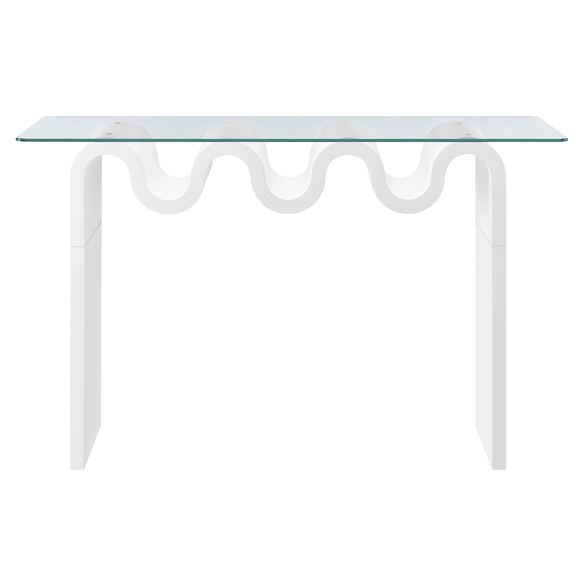 Use:The Ondine Glass Console Table stands out with its unique retro design, adding an artistic touch to any space. Its trendy frame, shaped in a bold wave-like form across the top, is crafted from durable materials and finished with a natural ash veneer, providing a rich, textured look, or a solid color finish to add some flair to your space. The squiggle-shaped foundation of this curved console table brings a sense of movement and fluidity, beautifully contrasted by the clear tempered glass top above it. The glass surface allows the wavy base to remain fully visible, making it the focal point of the design. The rounded edges on this glass top console table add softness to the overall aesthetic, while the clear plastic anti-skid grips offer stability to ensure the glass is secure. The Ondine 50 inch narrow console table is equipped with leveling, non-marking feet that keep the clear console table securely in place without damaging your floors. Whether used as a glass entryway table, sofa console table, or even as a sleek accent piece in a home office, this funky console table serves as a conversation piece and complements both contemporary and vintage-inspired decor. Glass Accent Console Weight Capacity: 154 lbs.