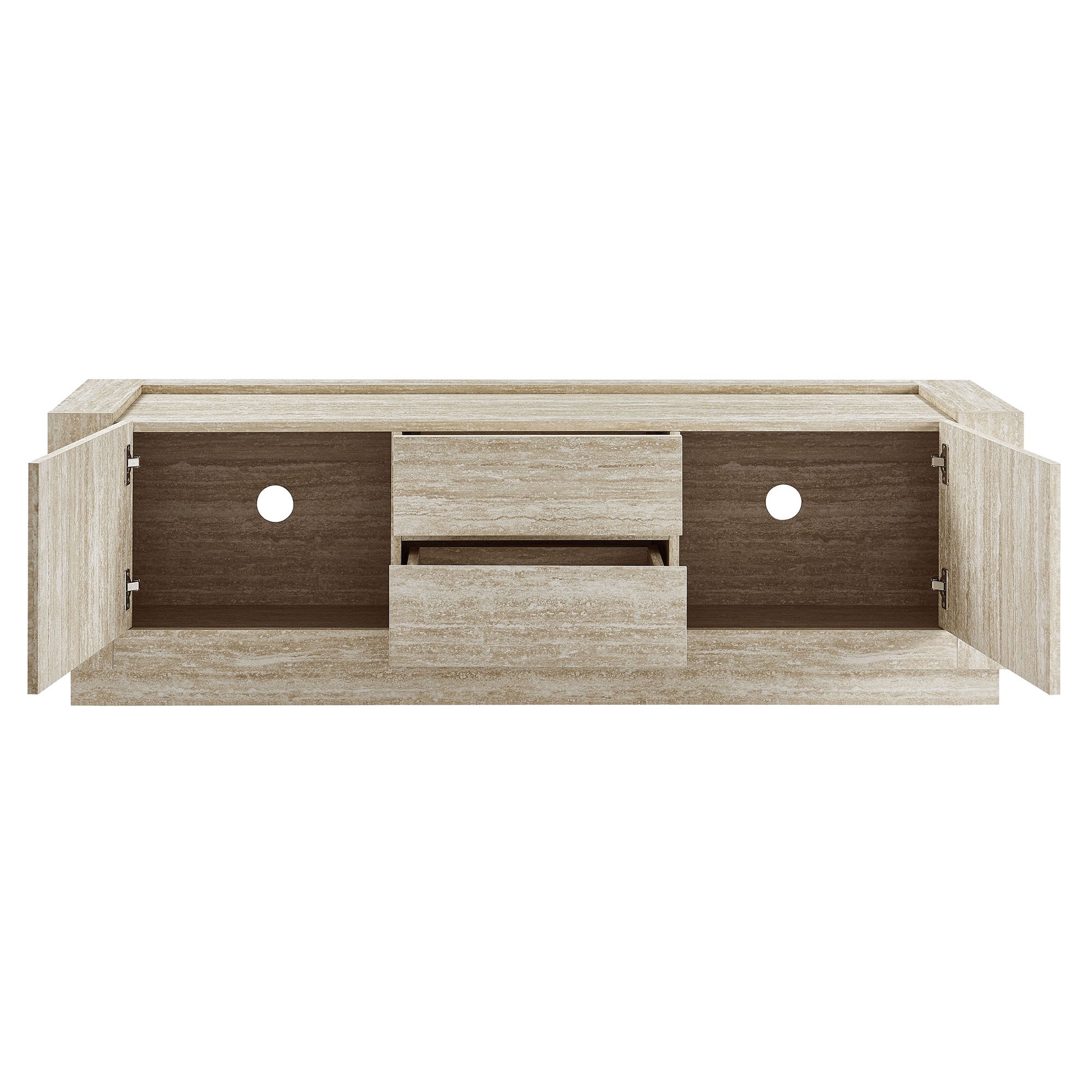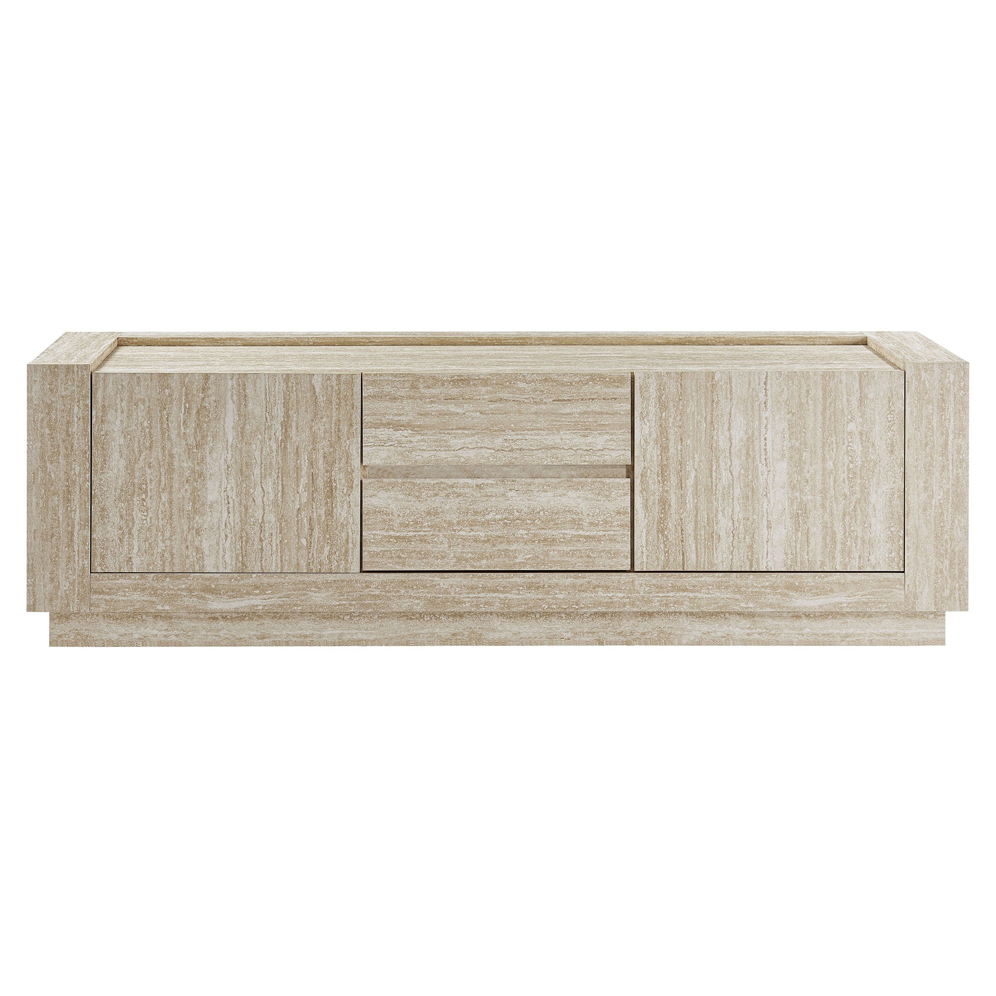 Use:Bring a fresh look to your home with the Hollis Modern TV Stand, a 59-inch media console designed to balance functionality and style. Featuring a sleek travertine laminate finish, this TV stand provides ample storage for all your media essentials and serves as a stylish TV cabinet for your wall-mounted TV. It has 2 doors and 2 drawers, with the interior featuring fixed shelving and deep drawers, allowing you to store electronics, media equipment, or decor with ease. The Hollis low profile TV stand provides versatile storage options while maintaining a clean and contemporary look. Its plinth base and non-marking foot pads ensure stability and floor protection, creating a beautiful entertainment center that complements your home?s decor. This floor TV cabinet is the storage solution you need every day to keep your space tidy and organized. Top Panel Weight Capacity: 271 lbs, Shelves: 44 lbs.