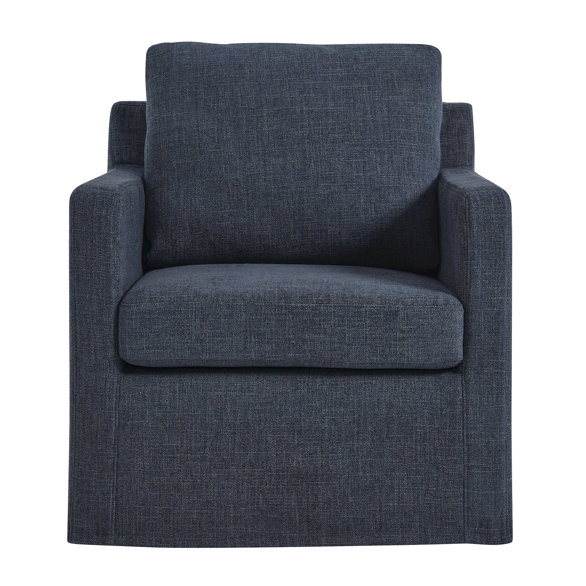 Use:The Serene Slipcovered Swivel Armchair seamlessly combines modern elegance with superior comfort. Upholstered in premium fabric, this upholstered accent chair features a removable, washable slipcover, making cleaning and maintenance a breeze. The swivel chair?s crisp lines and tailored profile enhance any decor style, fitting well in both home and office environments. Enjoy a smooth 360-degree swivel with this modern fabric chair, supported by a robust yet discreet iron base with non-marking floor glides to protect your floors. Dense foam padding and removable cushions provide luxurious comfort and support. Perfect as a stylish accent piece, this slipcovered armchair is a versatile and functional addition to any space in your home. Whether used as an accent chair for bedroom or swivel chair for living room, it showcases a chic and modern look with its polyester upholstery and generous cushioning. Assembly required. Weight Capacity: 330 lbs.
