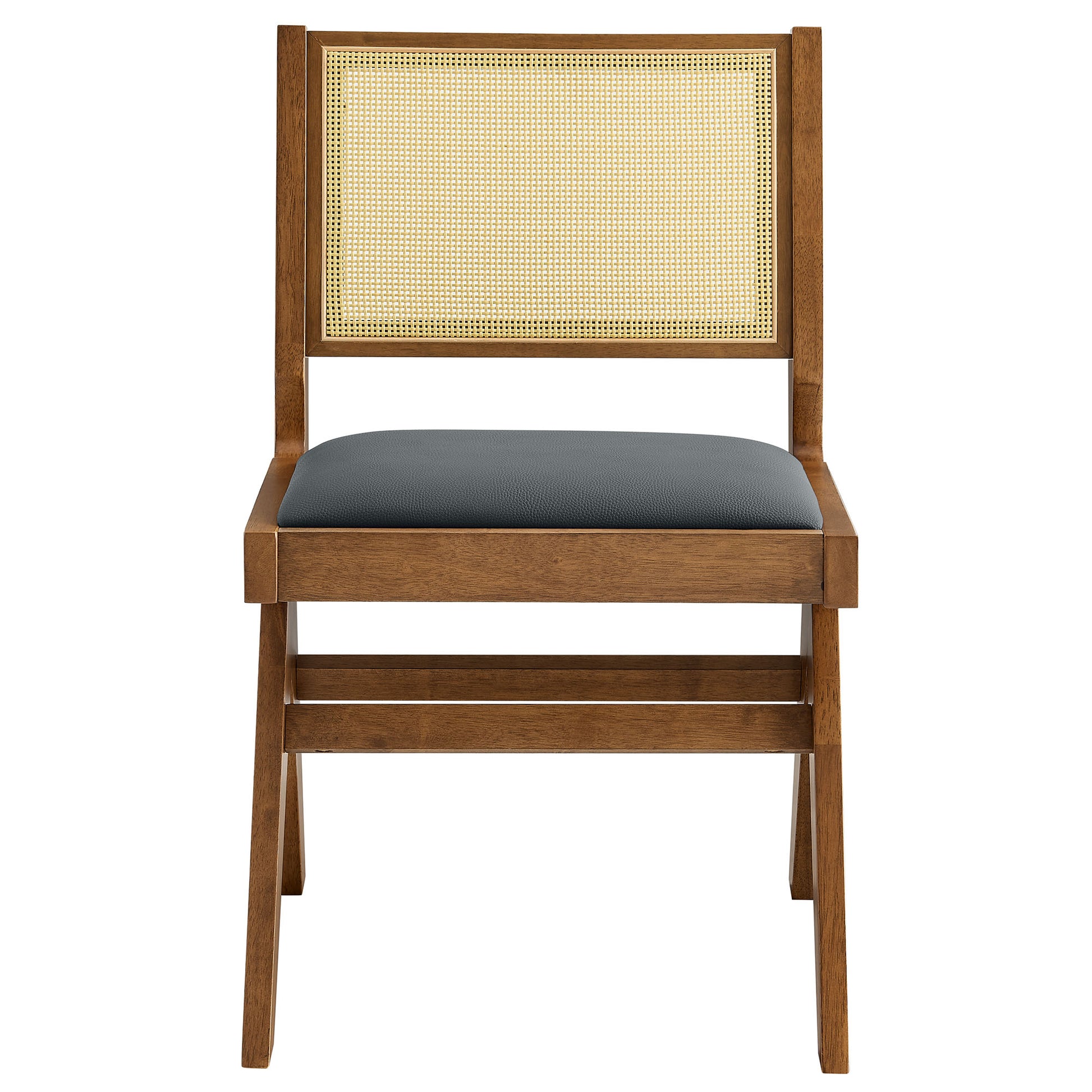 Use:Update your dining decor with the modern allure of the Thera Set of 2 Armless Rattan Dining Chairs. Crafted with a durable rubberwood frame, these wood dining chairs seamlessly blend retro design with modern aesthetics, making them a stylish choice as dining table chairs or kitchen table chairs. Featuring plush faux leather seats and breathable rattan cane backs, the Thera mid century modern dining chairs provide an inviting mix of textures and materials. The armless design of each rattan chair creates a sleek, streamlined silhouette that not only looks great but also fits easily with any dining setup. The legs feature a striking A-frame design that splays outward for added stability, and include horizontal stretchers to enhance the chair's durability and contribute to its contemporary geometric aesthetic. Whether placed around a dining table or used as vegan leather accent chairs in the living room, the Thera cane dining chairs bring modern flair to any setting. Assembly required. Weight Capacity: 507 lbs.