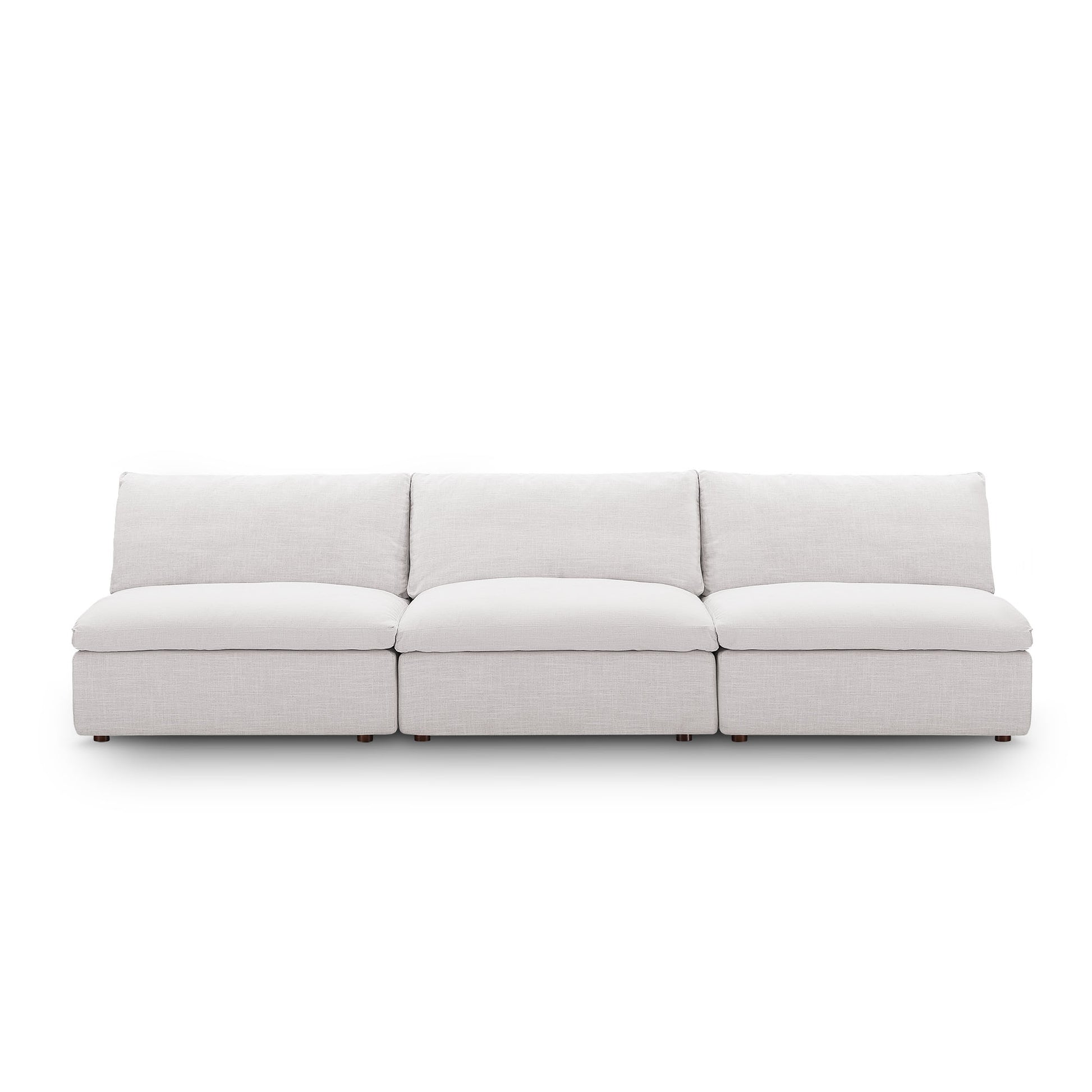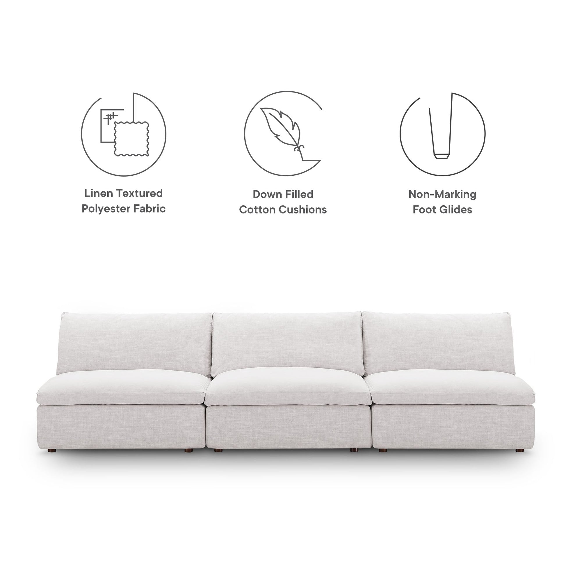 Use:A haven for cozy relaxation, the Commix Armless Sofa offers plush comfort and a clean-lined design. Made up of three armless chairs, its spacious profile makes an attractive statement in any modern home. Upholstered in polyester fabric for a linen-like texture, this contemporary modular sofa features generously padded down feather and cotton cushions, providing a luxurious sink-in feel. Built on a solid wood frame, the Commix deep sectional sofa is perfect for living rooms, family rooms, or game rooms. Made for sprawling out or curling up, this 3 seater sofa beckons you and guests to sit and stay a while. Includes plastic foot glides and three armless chairs, each supporting up to 331 lbs.,Contemporary Armless Modular Sofa