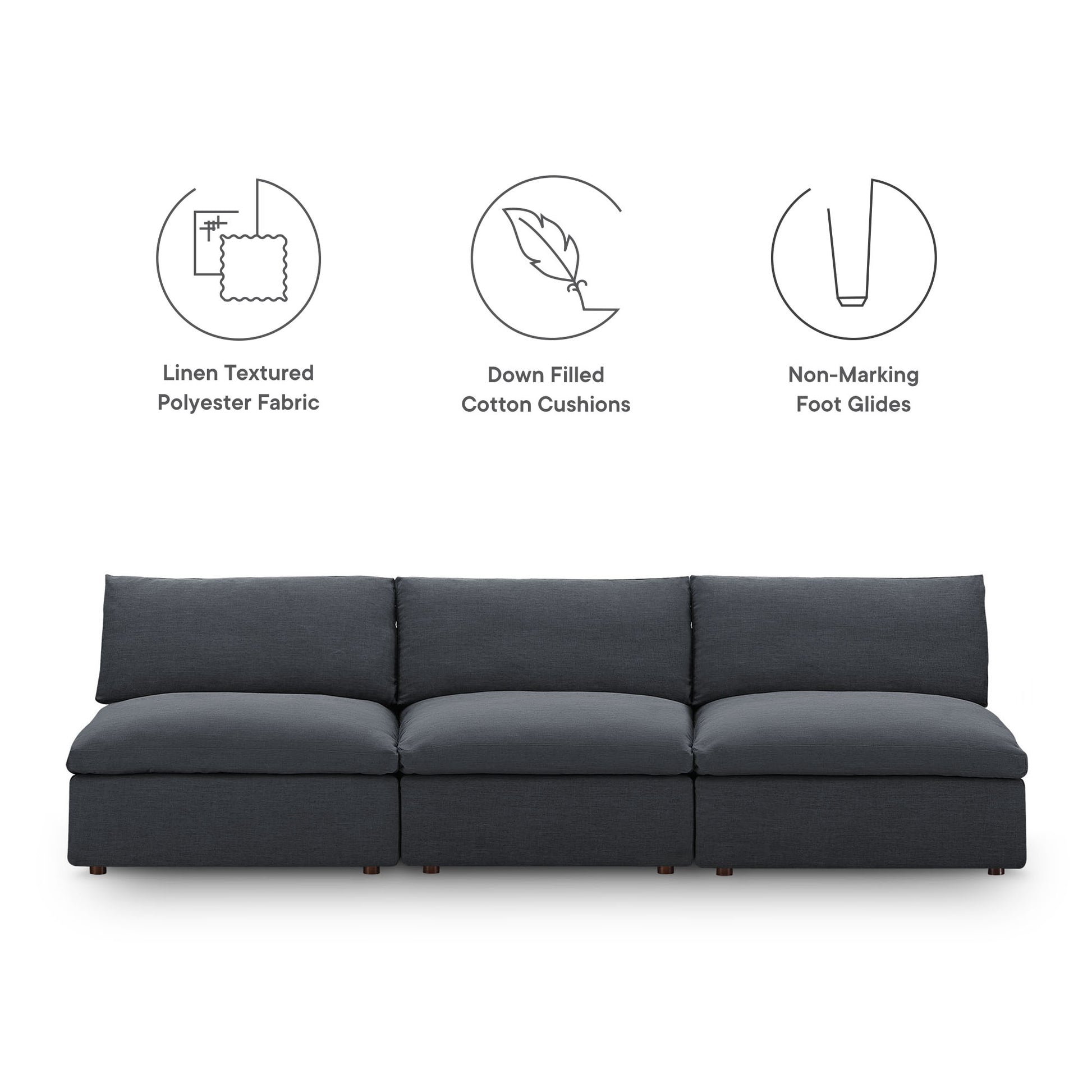 Use:A haven for cozy relaxation, the Commix Armless Sofa offers plush comfort and a clean-lined design. Made up of three armless chairs, its spacious profile makes an attractive statement in any modern home. Upholstered in polyester fabric for a linen-like texture, this contemporary modular sofa features generously padded down feather and cotton cushions, providing a luxurious sink-in feel. Built on a solid wood frame, the Commix deep sectional sofa is perfect for living rooms, family rooms, or game rooms. Made for sprawling out or curling up, this 3 seater sofa beckons you and guests to sit and stay a while. Includes plastic foot glides and three armless chairs, each supporting up to 331 lbs.,Contemporary Armless Modular Sofa